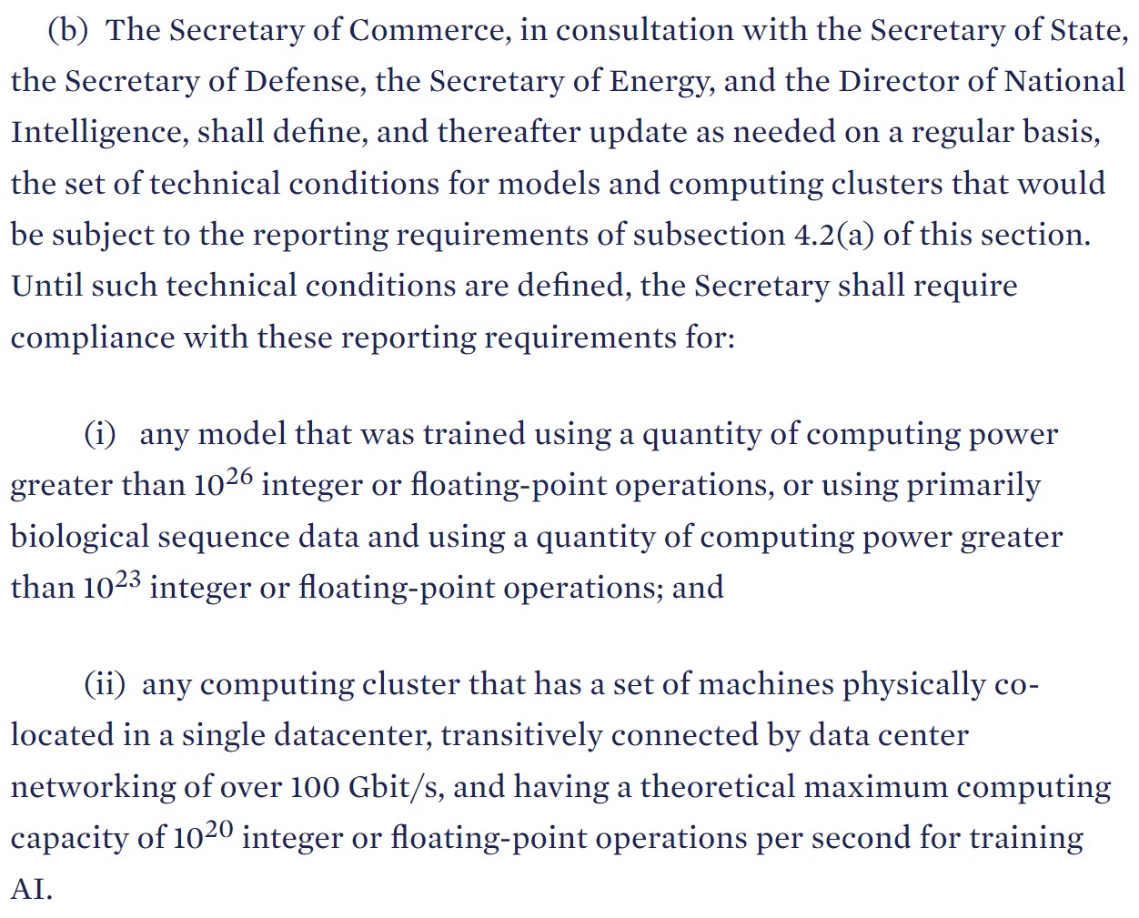 행정명령 원본을 살펴보면, 실제로 AI 안전성 보고 의무를 받을 빅테크 기업은 없다시피 하다는 점을 알 수 있었습니다. 왜냐고요? (행정명령 원본: 참조) 행정명령에서는 10^26(10의26승, 10을 26번 곱한 수) 이상 정수 또는 부동소수점을 연산할 수 있는 FLOPS 모델, 또는 바이오시퀀스 데이터 학습의 경우 10^23(10의23승) 모델로 규정을 했습니다. 감이 잘 안잡혀서 전문가분들께 물어보니, 이 정도 모델은 오픈AI GPT-4 아니면 구글이 만든다는 제미니(Gemini) 아니냐는 견해가 있었습니다.