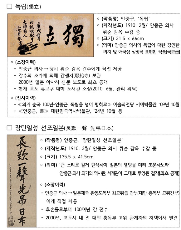 | 안중근 유묵 '長歎一聲 先弔日本' 광복 80년만에 한국 땅 밟다. |