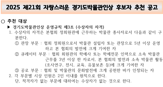 2025 제21회 자랑스러운 경기도박물관인상 후보자 추천 공고 |