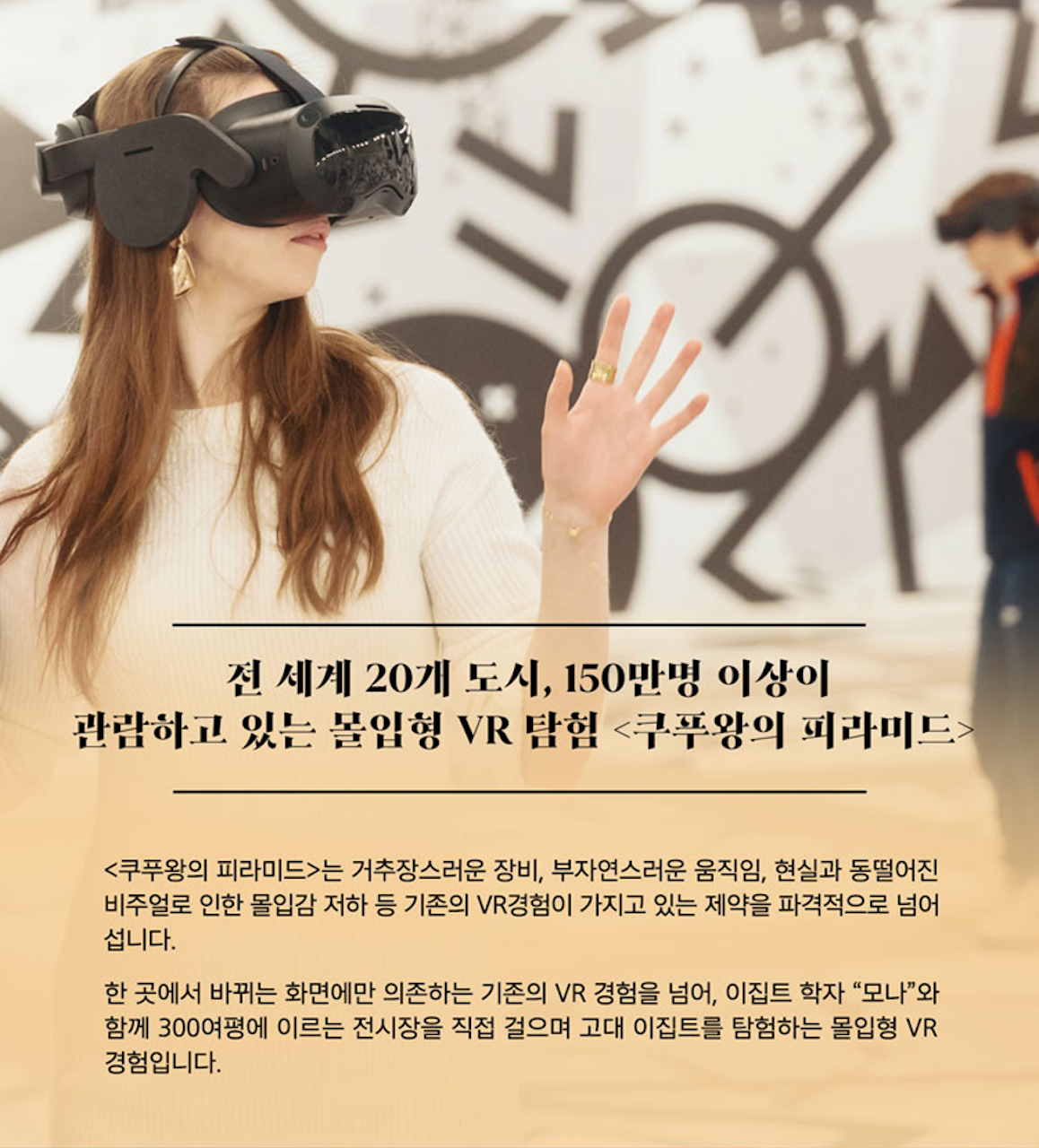 해외 전시에서 찬사를 받은 ‘타이타닉(Titanic)’, ‘베르사유(Versailles)’, ‘가우디(Gaudi)’를 비롯, VR eSports Arena(Versus 게임) 등 아케이드 콘텐츠를 선보였으며, 공간 전체에 몰입하여 스토리가 더욱 생생하게 느껴진다는 호평이 이어졌습니다.