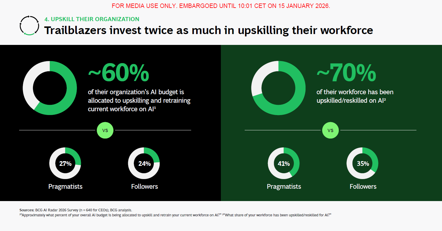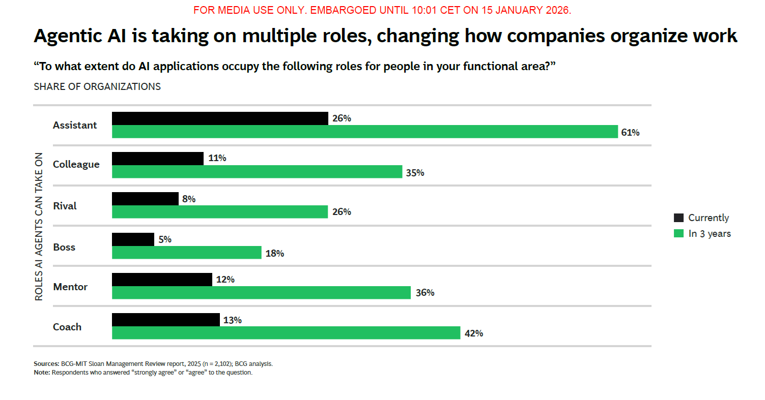 이 변화는 데이터로도 증명됩니다. BCG의 조사에 따르면 현재 AI의 주된 역할은 비서(26%)에 머물러 있었습니다. 리더들은 3년 내 이런 AI의 역할이 급변할 것으로 내다보고 있습니다. 크게 두 가지로 독립적 수행자와, 의사결정자입니다. 인간의 개입 없이 업무를 완결하는 비율이 39%로 늘어나며, 심지어 AI가 인간에게 지시를 내리거나 판단을 내리는 권한을 가질 것이라는 응답도 35%에 달했습니다.
