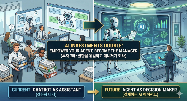 CEO가 자신의 직을 걸고 2배로 늘린 예산은 어디로 흘러가고 있을까요? 답은 명확합니다. 우리가 흔히 챗봇이라고 부르는 생성형 AI를 넘어 스스로 행동하는 AI 에이전트입니다. BCG 보고서는 2026년 기업 AI 예산의 30% 이상이 이 에이전트 개발과 도입에 할당될 것으로 분석했습니다. 왜일까요? 사장님들이 보기에 챗봇은 말만 번지르르한 반면 AI 에이전트는 진짜 ‘일’을 하기 때문입니다.