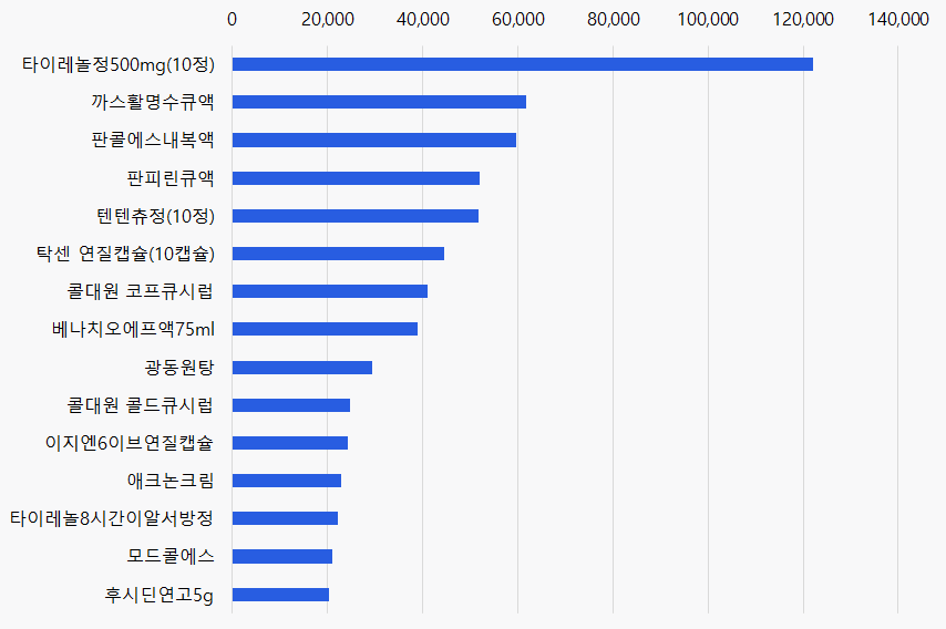 💊 타이레놀 시리즈 외에도 탁센, 이지엔식스, 탁센 등 해열진통제와 판콜, 콜대원, 광동원탕같은 감기약이 다수가 상위권에 포진되어 있습니다. 까스활명수, 베나치오처럼 마시는 소화제와 후시딘 연고 등 상처 치료를 위한 제품도 마찬가지예요. 해당 제품들은 모두 감기, 소화불량이나 상처 치료를 위한 제품으로, 소비자들이 가벼운 질환이나 증상에 대해서는 스스로 판단하고, 약을 구매하고 복용하는 경향✍️을 나타낸다고 볼 수 있어요. |