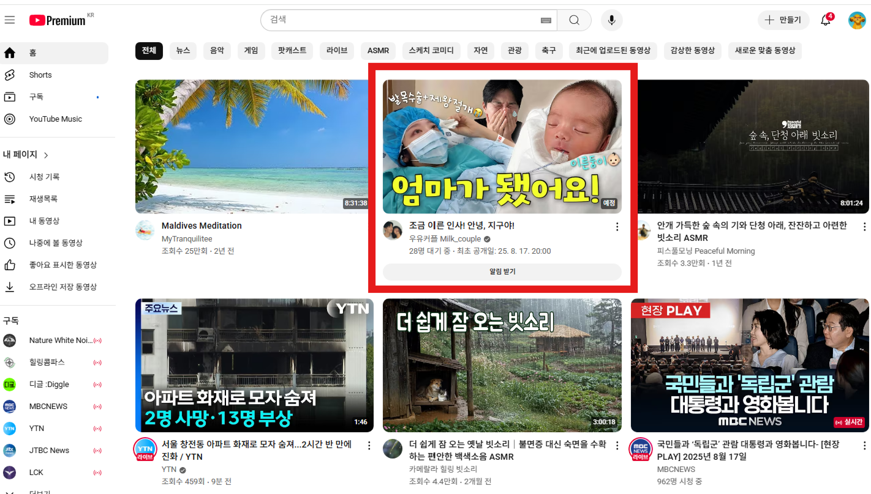 2. ์์ฒญ์๊ฐ ์ ํ๋ธ์ ๋ค์ด๊ฐ์ ๋์ ์ฒซ ํ๋ฉด์ธ 'ํ์'์ ๋
