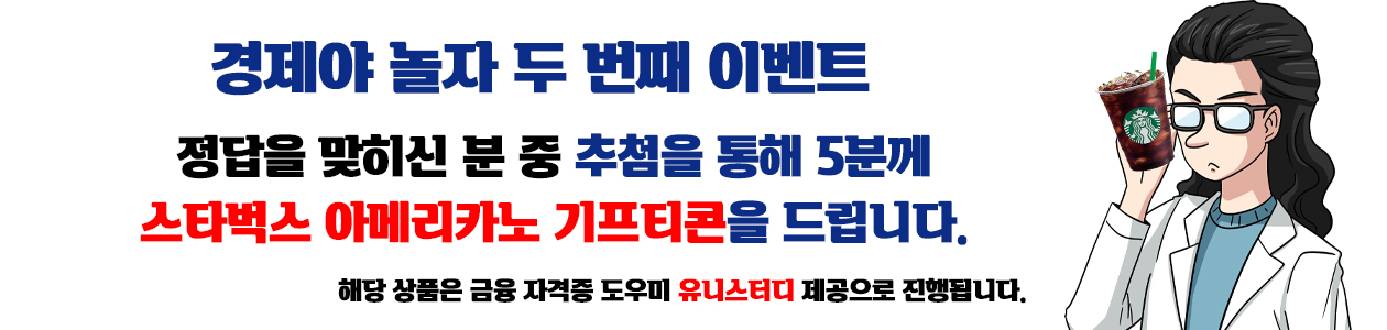 다시 돌아온 이벤트~! 오늘은 가벼운 문제를 통해 ‘스타벅스 아메리카노 1잔’을 쏩니다. 문제의 정답을 맞혀주신 분 중 추첨을 통해 다섯 분께 선물을 드릴게요. 정답은 다음 주 수요일(4월 7일)까지 받겠습니다. [문제]한국경제신문에는 다양한 뉴스레터가 있습니다. 다음 중 한경의 뉴스레터 개수는? ① 12 ② 13 ③ 14 ④ 15 ⑤ 16 해당 이벤트는 금융 자격증 도우미 유니스터디의 제공으로 진행됩니다. 한국경제신문 경제교육연구소 COPYRIGHT ⓒ 한국경제신문 ALL RIGHT RESERVED. 수신거부 Unsubscribe |