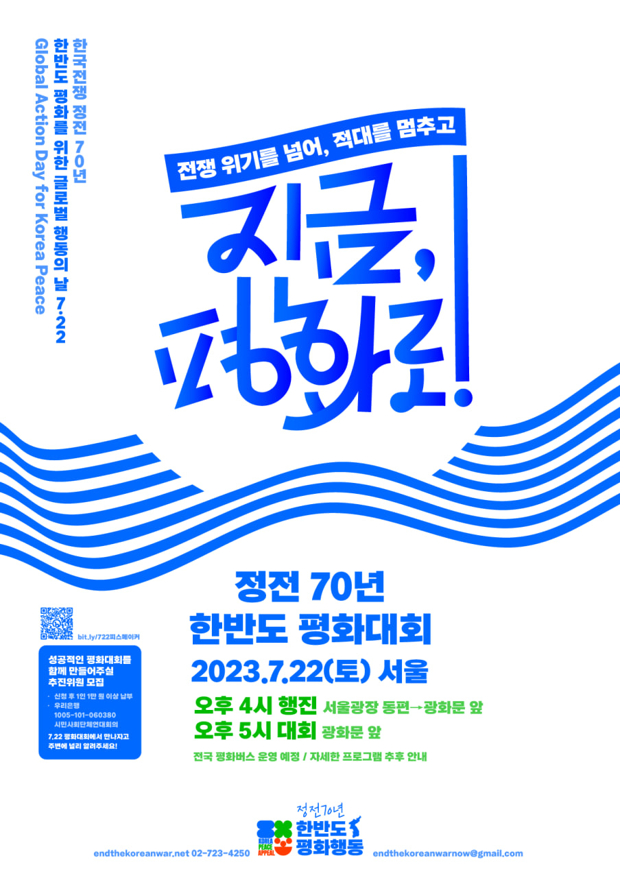 정전 70년인 올해, 한반도에는 유례 없는 전쟁 위기가 이어지고 있습니다. 우발적인 무력 충돌의 가능성도 높아져, 불안정한 휴전 상태마저 위태로운 현실입니다. 대화 채널이 모두 끊긴 채 군사적 긴장이 높아지는데, 정부는 무력 충돌을 예방하고 다시 대화 여건을 만들 수 있는 현실적인 해법을 내놓지 않고 있습니다. “어떠한 경우에도 한반도에서 다시 전쟁은 안 된다”는 분명한 메시지, 평화적 문제 해결을 촉구하는 시민의 목소리가 그 어느 때보다 절실합니다. 한국전쟁 정전협정 체결 70년이 되는 7월 27일을 앞두고 <한반도 평화를 위한 글로벌 행동의 달>을 정해 집중적인 평화행동을 진행합니다.