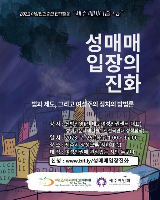 <성매매 입장의 진화 ;법과 제도, 그리고 여성주의 정치의 방법론> 2023 여성인권증진 연대활동 "제주 페미니즘+a" 아카데미 4강이 열렸습니다. 최근의 성매매 담론을 살펴보면서 전세계 다양한 국가에서 성매매를 어떻게 처벌하고 있는지 그 차이를 살펴봅니다.