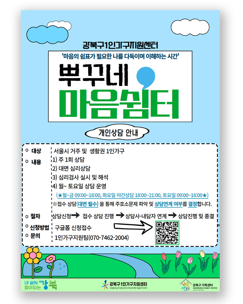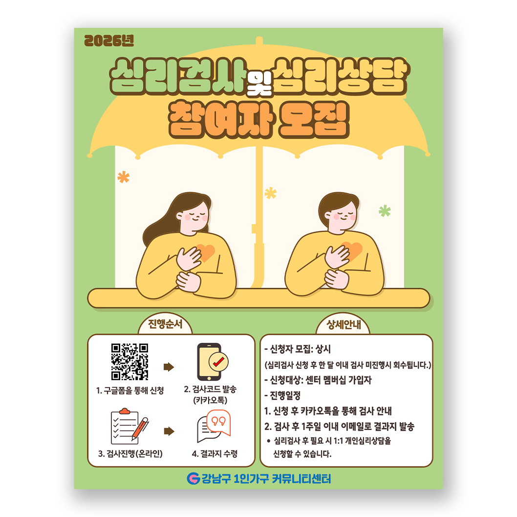 ํผ์ ์ด๋ค ๋ณด๋ฉด ๋ฌธ๋ ๊ณตํํจ์ด ๋ฐ๋ ค์ค๊ฑฐ๋, ํธ์ด๋๊ธฐ ์ด๋ ค์ด ๊ณ ๋ฏผ์ด ์๊ธธ ๋๊ฐ ์์ฃ . ๊ทธ๋ด ๋ '1์ธ ๊ฐ๊ตฌ ๋ง์ ์๋ด ์๋น์ค'๋ฅผ ์ ๊ทน ํ์ฉํด ๋ณด์ธ์. ๋ด ๋ง์ ์ํ๋ฅผ ์ง๋จํด ์ค ๊ธฐ์ด ๊ฒ์ฌ๋ถํฐ, ์ ๋ฌธ๊ฐ์ ์ฌ์ธต ์๋ด๊น์ง ์ง์๋ฉ๋๋ค. ์ง๊ณผ ๊ฐ๊น์ด '1์ธ ๊ฐ๊ตฌ ์ง์์ผํฐ'๋ 'โโ๊ตฌ ๊ฐ์กฑ์ผํฐ' ํํ์ด์ง์ ์ ์ํด '1์ธ ๊ฐ๊ตฌ ์ฌ๋ฆฌ์๋ด' ๊ด๋ จ ํ๋ก๊ทธ๋จ์ ์ ์ฒญํ๋ฉด ๋! ๊ทธ๋ฆฌ๊ณ ๋น์ทํ ๊ณ ๋ฏผ์ ๋๋๊ณ ์ทจ๋ฏธ๋ฅผ ๊ณต์ ํ๋ ์ฒญ๋