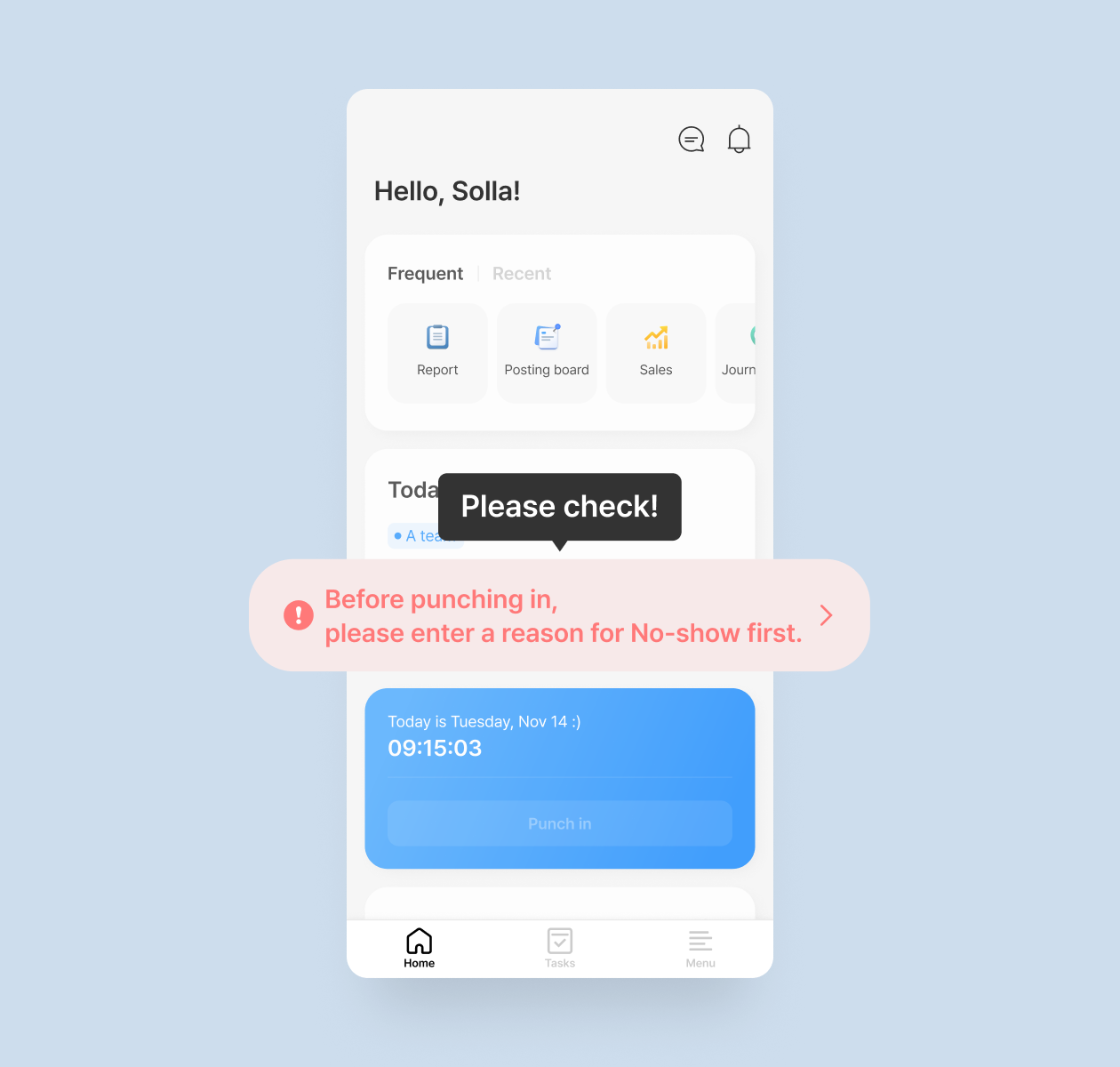 We'll walk you through the situations where you'll need to provide a reason for a No-show or Automatic punch-out before punching in.