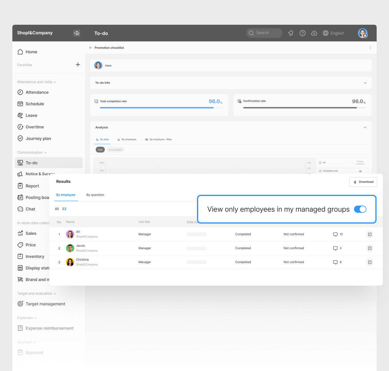 A 'View only employees in my managed groups' filter has been added to the task results page in the To-do feature. When activated, you can quickly review task results uploaded by employees in the groups you manage.