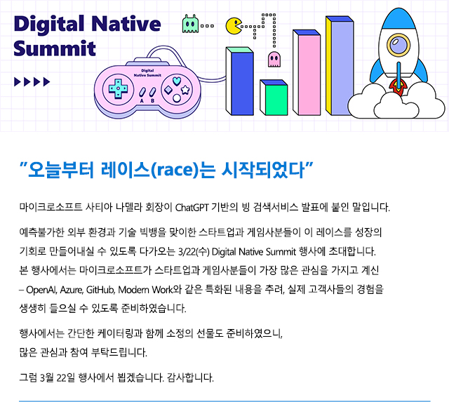 예측불가한 외부 환경과 기술 빅뱅을 맞이한 스타트업들이 이 레이스를 성장의 기회로 만들어내실 수 있도록 다가오는 3/22(수) Digital Native Summit 행사에 초대합니다!
