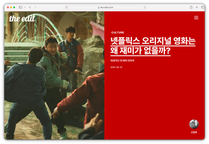 영화 좋아하는 사람이라면 넷플릭스 오리지널 영화 노잼설에 대해 공감할 거야. 나는 넷플릭스 오리지널 작품을 예전에는 좋아해서 꼭 챙겨봤는데, 어느 순간부터 기대가 점점 없어지다가 이제는 거의 안 보고 있어. 시리즈는 꽤 재밌는데 이상하게 영화만 그래. 장르를 편식하지 않는 편인데도 대부분 아쉬웠어. 비교적 최근에 개봉한 <황야>, <레벨 문>, <독전2>, <길복순>이 모두 만족스럽지 못했거든. 그래서 김철홍 영화평론가에게 물어봤어. "요즘 넷플릭스 영화, 저만 재미없나요?" 그 질문에 대한 대답이 돌아왔으니 궁금한 까탈로거는 [여기]로 들어가서 읽어 봐. |