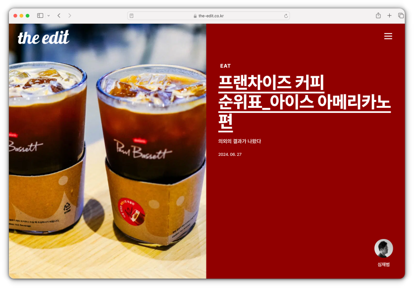 힙한 카페, 멋진 카페, 분위기 좋은 카페, 좋지. 근데 멋진 카페 좋아하는 나도 사실 프랜차이즈 커피를 더 자주 갈 수밖에 없어. 노트북으로 작업하기엔 스타벅스, 투썸 같은 곳이 더 쾌적하니까. 그렇다면 어떤 프랜차이즈 카페의 커피가 제일 맛있을까? 궁금하지? 심재범 커피 칼럼니스트가 김건세 바리스타와 함께 동행하며 여섯 브랜드의 순위를 매겼어. 평가 메뉴는 아이스 아메리카노. 순위는 아래에 적어둘게. 자세한 리뷰는 [여기]에서 확인해줘.
