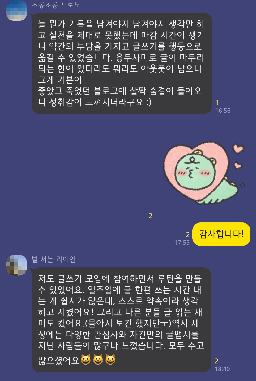 ๋ก๋ ํ๊ธฐ!๋ฅผ ๋ชฉํ๋ก ํ๊ณ ์์ด์. ๊พธ์คํ ๊ธ์ ์ฐ๋ฉด ์ปค๋ฆฌ์ด์๋, ๊ฐ์ธ์ ์ผ๋ก๋ ๋์์ด ๋ ๋งํ ๊ธฐํ์ ์ผ๋ค์ด ๋ง์ด ์ผ์ด๋๋๋ฐ '๊พธ์คํ'ํ๋ค๋ ๊ฒ ์์ฒด๊ฐ ์ด๋ ต๊ฑฐ๋ ์. ์ฃผ๋ณ์ ํจ๊ป ๊ธ์ ์ฐ๋ ์ฌ๋๋ค์ด ์์ผ๋ฉด ์ด์ผ๊ธฐ๊ฐ ๋ฌ๋ผ์ง์ฃ . ๊ทธ๋์ ๋ง๋ค๊ฒ ๋ ๋ชจ์์ด๋๋๋ค! - ๊ธฐ์กด ๋ฉค๋ฒ๋ค์ ํ ๋ง๋ ์ง๋ ์ฃผ, ์ค์ฌ์ผ์ถ ๋ด์ค๋ ํฐ๋ฅผ ์ฝ๊ณ [์ข์์ด์]์ ์๊ฒฌ์ ๋จ๊ฒจ์ฃผ์ ์ต๋ช