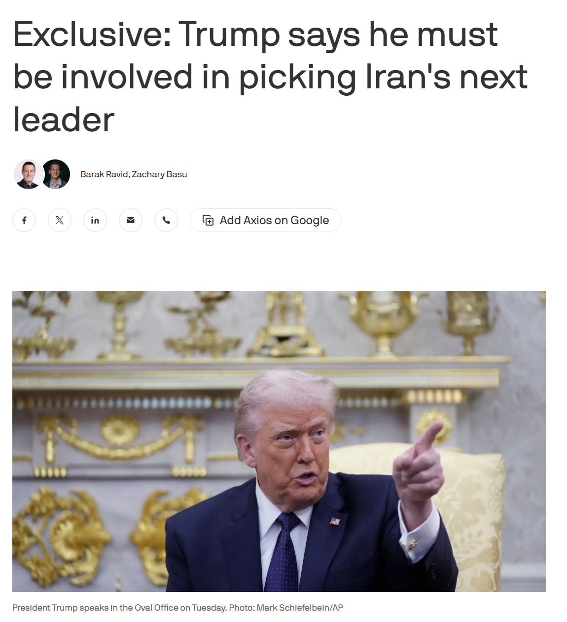 미국과 이스라엘이 일주일 째 이란을 공습하며 제공권을 거의 장악. 남은 큰 허들은 이란에 친미 정권을 수립하는 것. 트럼프 본인이 직접 관여하겠다고 선언. ( Axios인터뷰 - 연합뉴스)