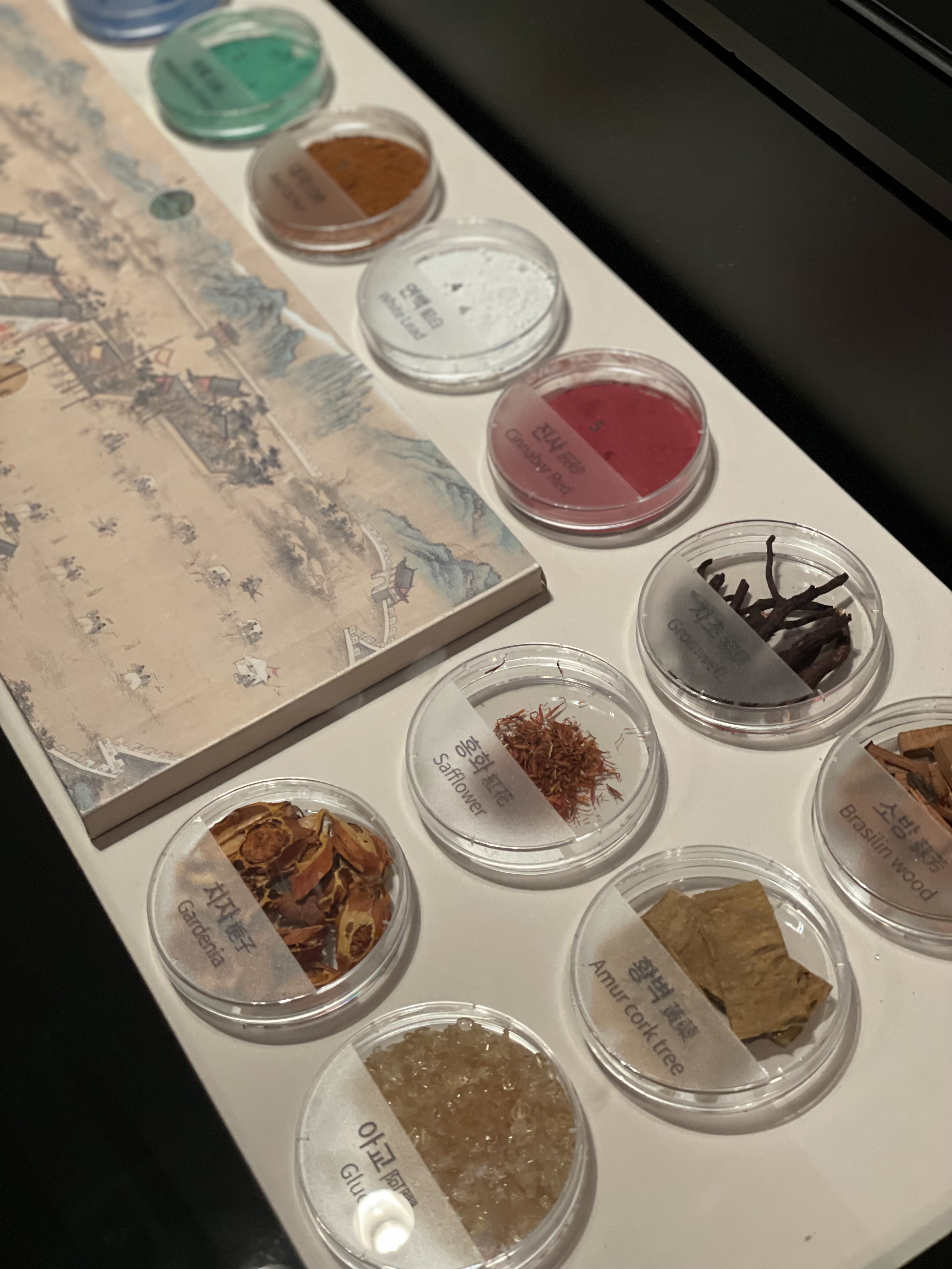 옛 그림은 먹뿐만 아니라 다양한 안료를 사용하여 색을 표현했습니다. 건축의 단청, 석채의 안료는 흙이나 광물에서 채취하였고, 한복의 실과 원단의 염색, 맑은 표현에는 동식물을 통해 염료를 채취하였습니다.
