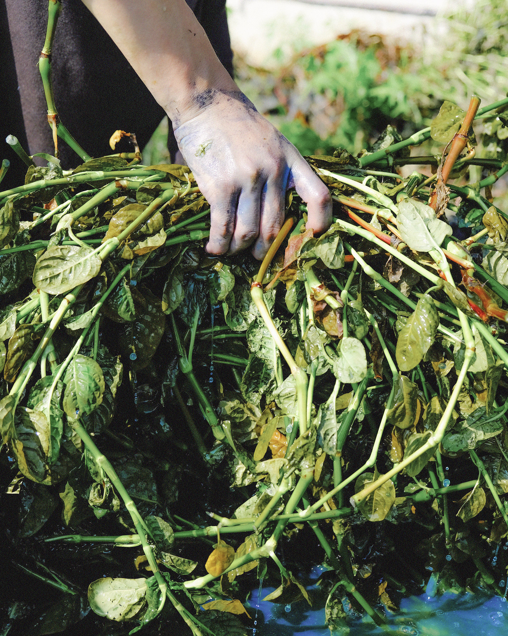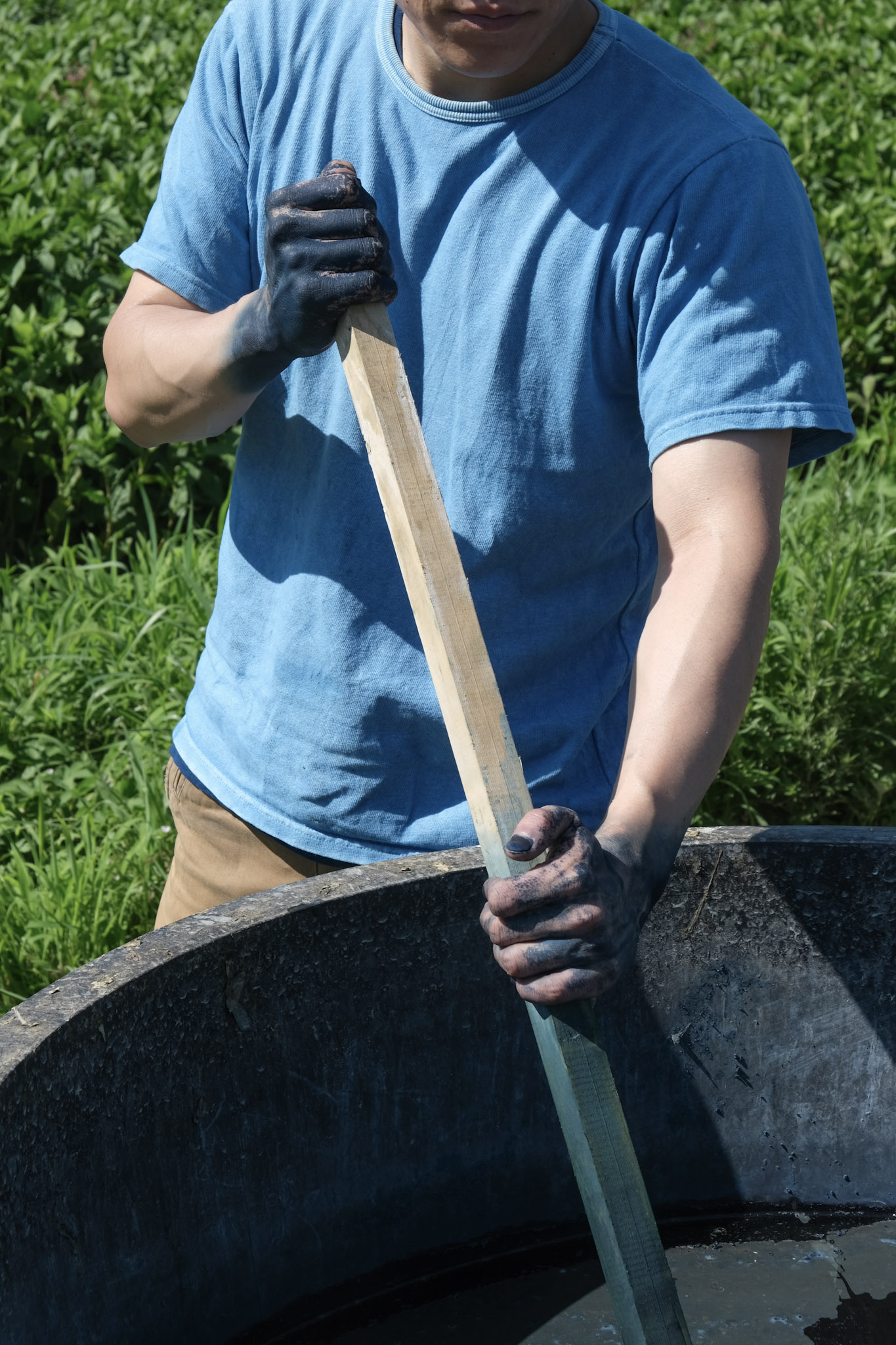 밭에서 자라는 쪽은 여름에 비로소 수확을 한다. 수확된 쪽에서 염료를 추출하는데, 그 진행 방식도 매우 세심하다. 우선 쪽을 수확한 후 불용성인 인디고가 수용성이 되도록 햇빛이나 열을 가한다. 통에 물을 담근 후 대기열로 인해 가수분해를 시켜주는 것인데 작가마다 잎만 넣기도 하고, 줄기를 함께 넣기도 하는 등 각자의 방식이 있다. 그 후에 조갯가루, 막걸리 효소 등의 재료를 넣어서 산소를 주입해 주는데, 이 과정을 통해 니람(침전물)이 만들어진다. 발효의 과정을 거쳐 만들어진 것으로 이를 염료의 전 단계로 본다. 이처럼 발효한 쪽물로 염색을 하면 우리가 잘 아는 진한 파랑의 ‘쪽빛’의 색깔이 난다. |