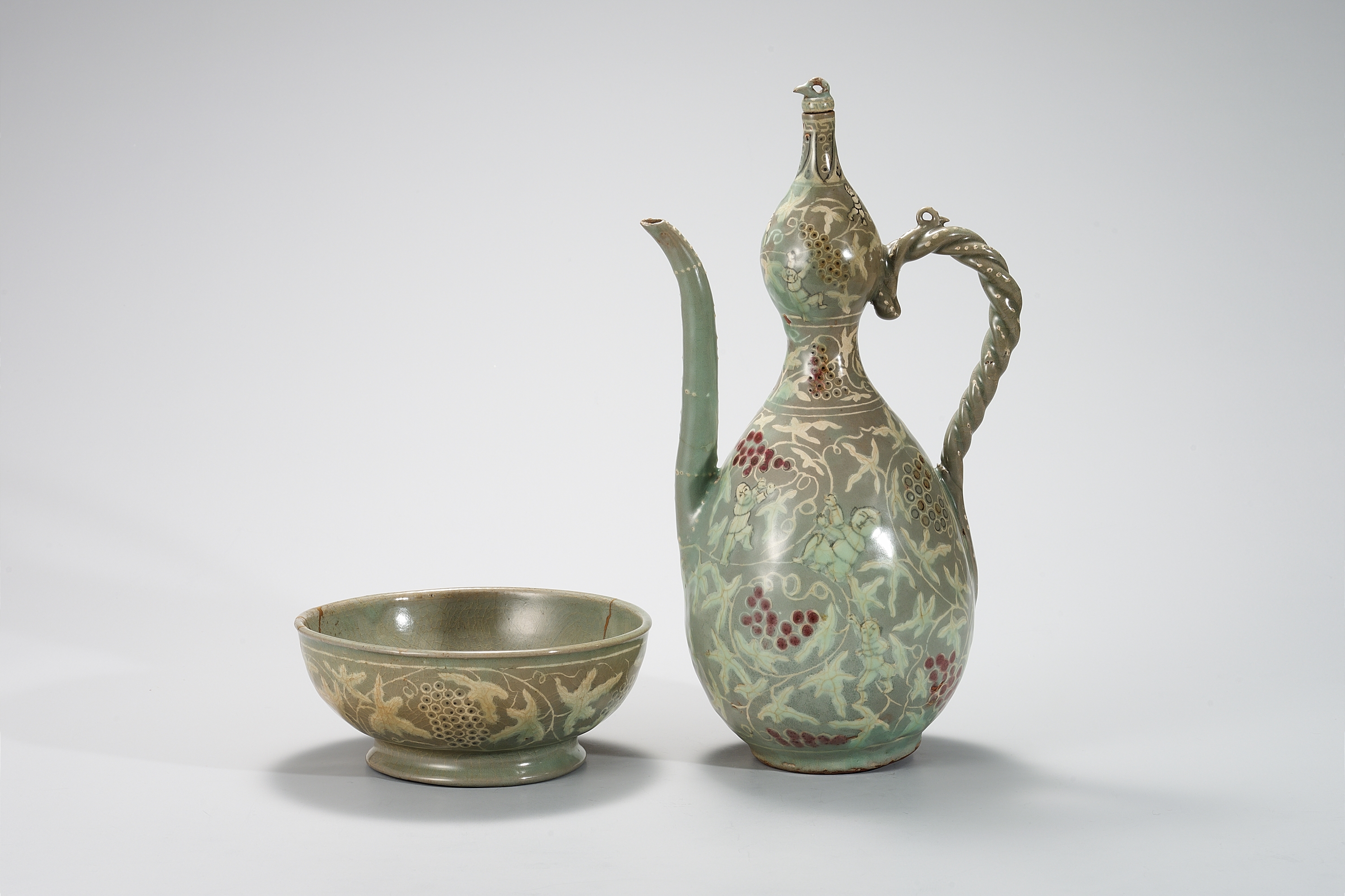 청자 상감 동화 포도 동자 무늬 조롱박 모양 주전자와 받침 / 국립중앙박물관 소장 |