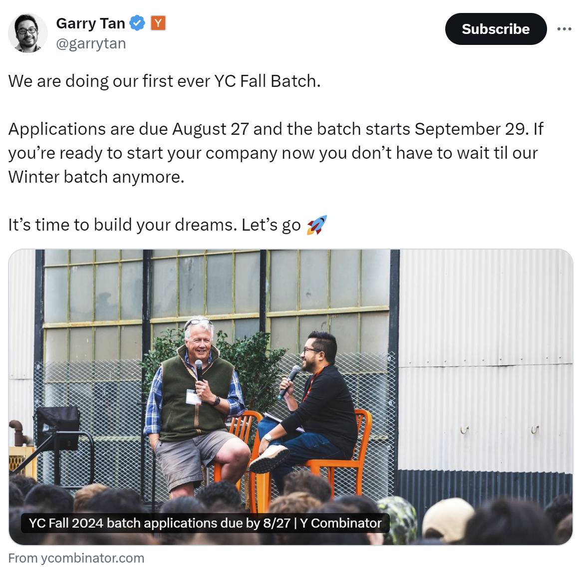 와이콤비네이터 가을 배치 프로그램을 알리는 개리 탠의 트윗 |