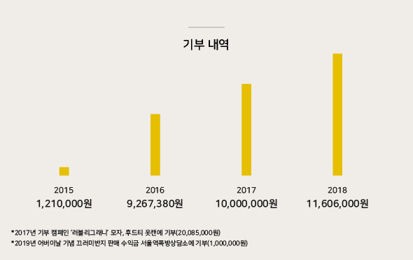 할머니의 행복한 일상을 위해 마르코로호는 여성 노인의 높은 빈곤율과 사회 소외 문제를 해결하기 위해 시작되었어요. 할머니들께 행복한 일상을 드린다는 미션으로 매듭 액세서리를 통해 할머니들의 일자리와 사회참여의 장을 만들고 있지요. 여러 해를 할머니들과 함께하면서 우리는 할머니들이 겪는 문제가 더 많다는 것을 알게 되었어요. 일자리만으로는 할머니들께 행복한 일상을 선물할 수 없다는 생각이 들었죠. 그래서 우리는 할머니의 일자리 만들기와 함께 할머니들의 주거, 위생 문제를 개선하여 할머니들의 일상을 행복하게 만들어 드릴 수 있도록 다양한 시도를 하고 있어요. 마르코로호는 할머니들 삶을 위한 가치소비를 제안하여, 평범한 일상에 사회적 가치를 더하는 소셜라이프스타일 브랜드로 한 발짝 나아갈 준비를 하고 있답니다. 마르코로호의 기부 이야기 아가, 우리가 같이 이만큼 했다
