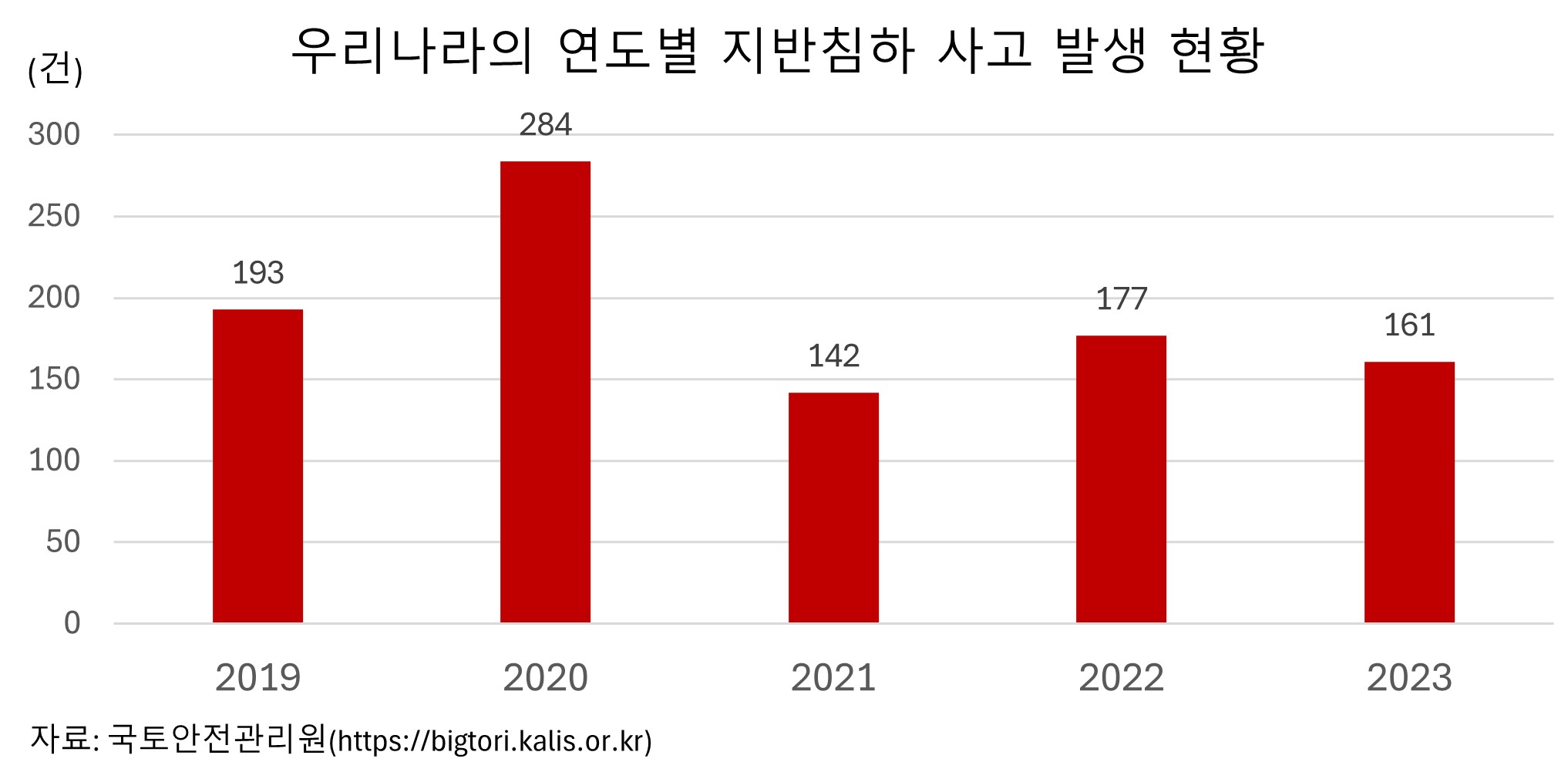 최근 잇따른 지반침하 사고로 시민들의 불안감이 다시금 높아지고 있습니다. 올해 들어 지난 3월 24일 서울 강동구 명일동의 한 교차로에서 도로가 함몰되는 사고가 발생했고, 4월 11일에는 경기 광명시 일직동 신안산선 공사현장 및 주변도로가 붕괴되는 사고가 발생했습니다. 부산 사상구에서는 4월 13일과 14일 연이어 인근의 서로 다른 지점에서 도로침하 사고가 발생했습니다. 이 외에도 여러 곳에서 사고위험이 신고되고 있습니다. 지반침하는 시민의 생명 및 신체 보호, 도시인프라 유지관리 측면에서 중요한 재난입니다. 특히, 고밀 도시개발과 지하공간 개발이 많이 이루어진 우리나라 대도시에서는 도처에 지반침하 위험이 도사리고 있고 언제든지 발생할 수 있는 재난입니다. |