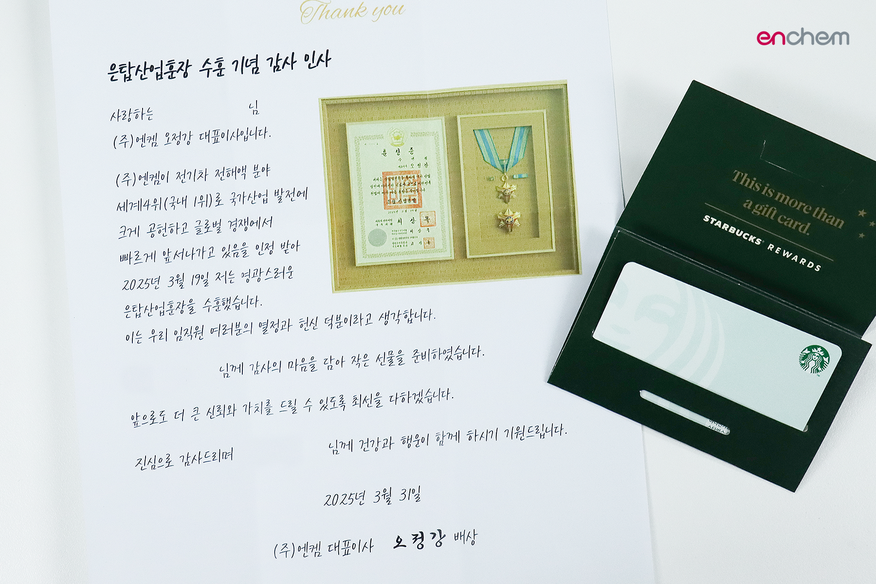 대표이사님께서는 이번 은탑산업훈장 수훈을 기념해 엔켐 임직원 여러분께 진심 어린 감사 메시지를 전하고, 작은 선물도 준비해주셨어요! |