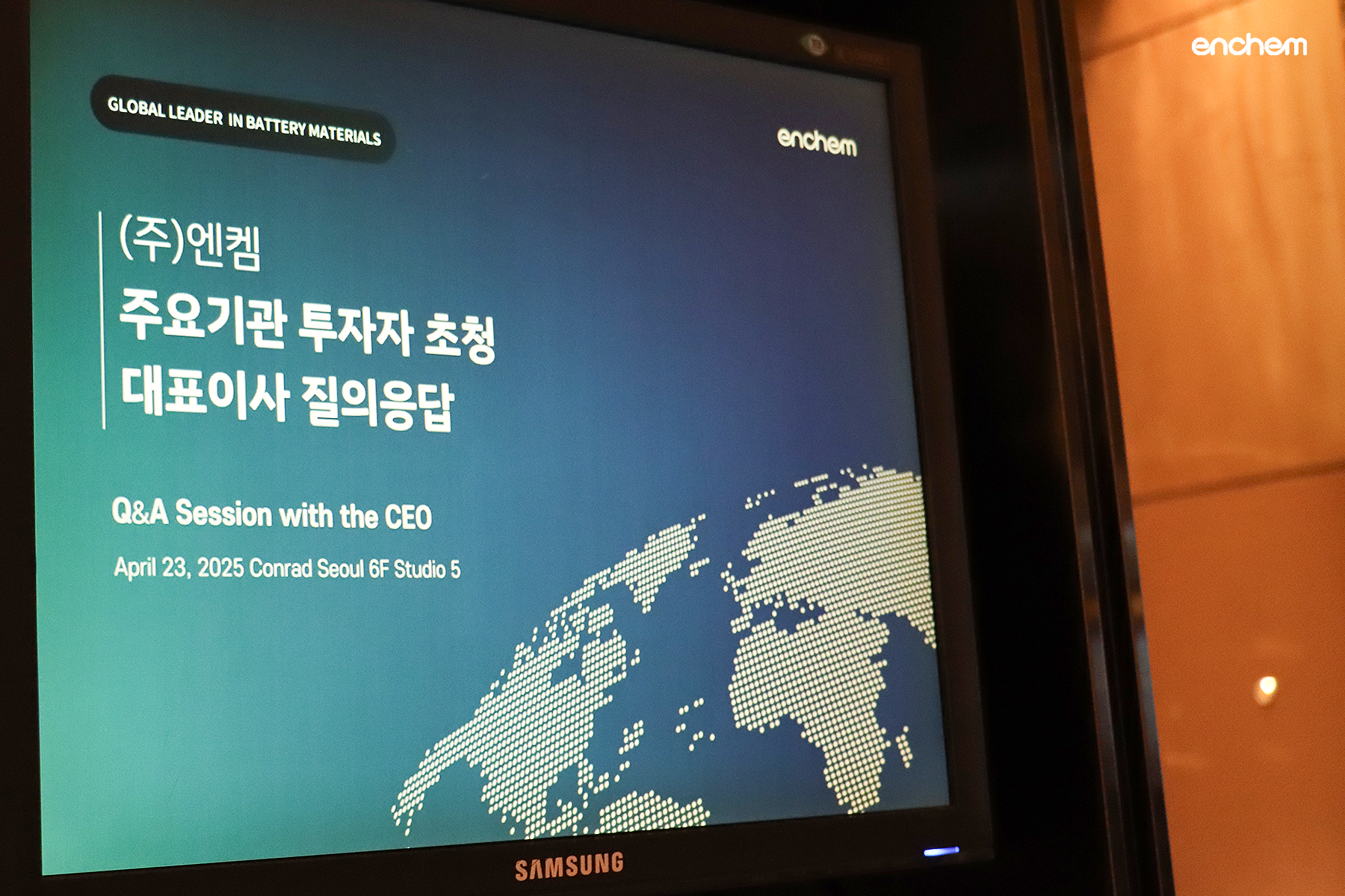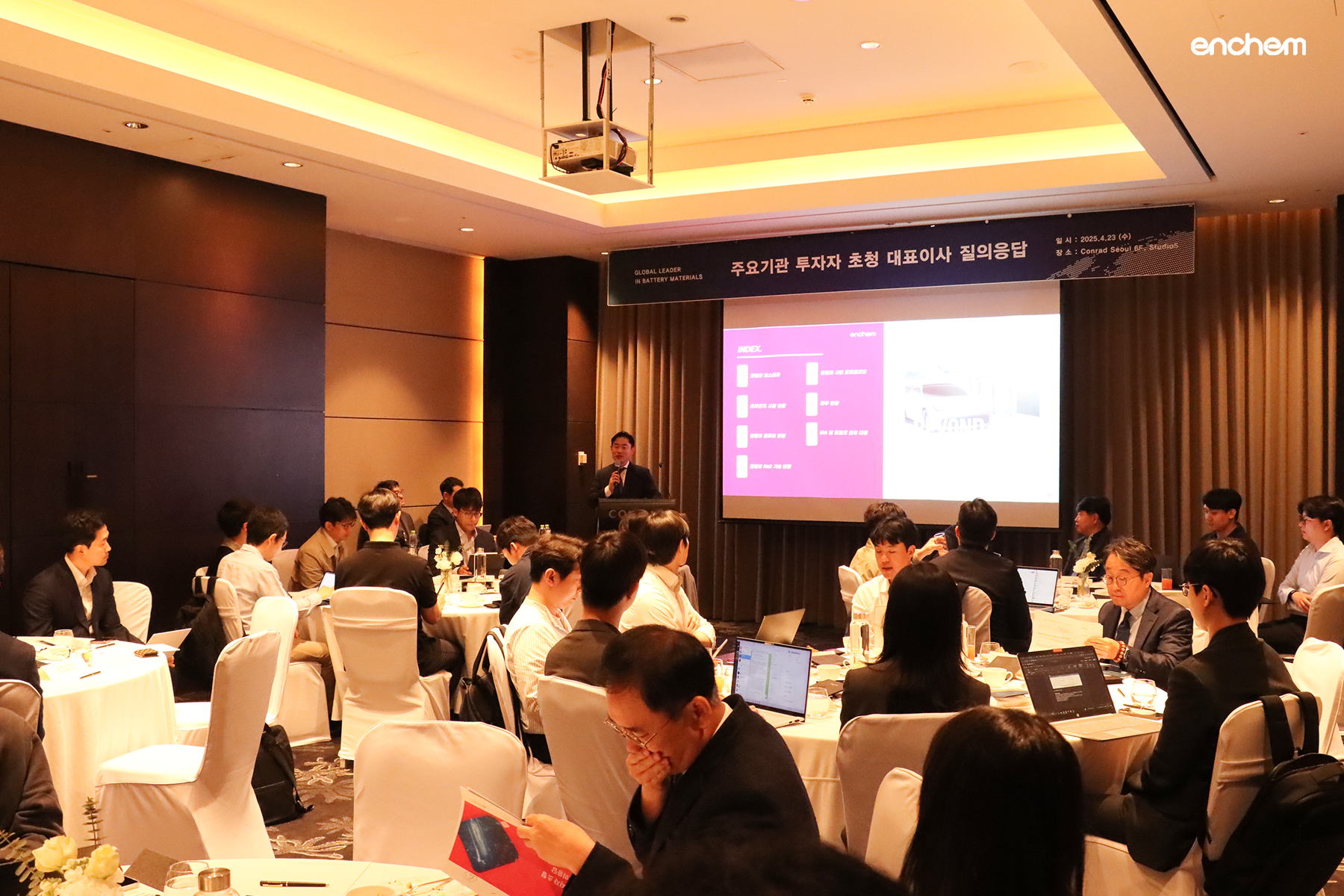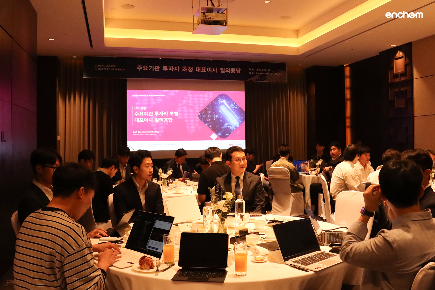 지난 4월 23일 수요일, 서울 여의도 콘래드 호텔에서 엔켐의 주요 투자자 초청 대표이사 질의응답 행사가 성공적으로 마무리되었어요. 이날 행사에는 국내 주요 자산운용사 펀드매니저 35명이 참석해 엔켐의 성장 가능성에 높은 관심을 보였어요.