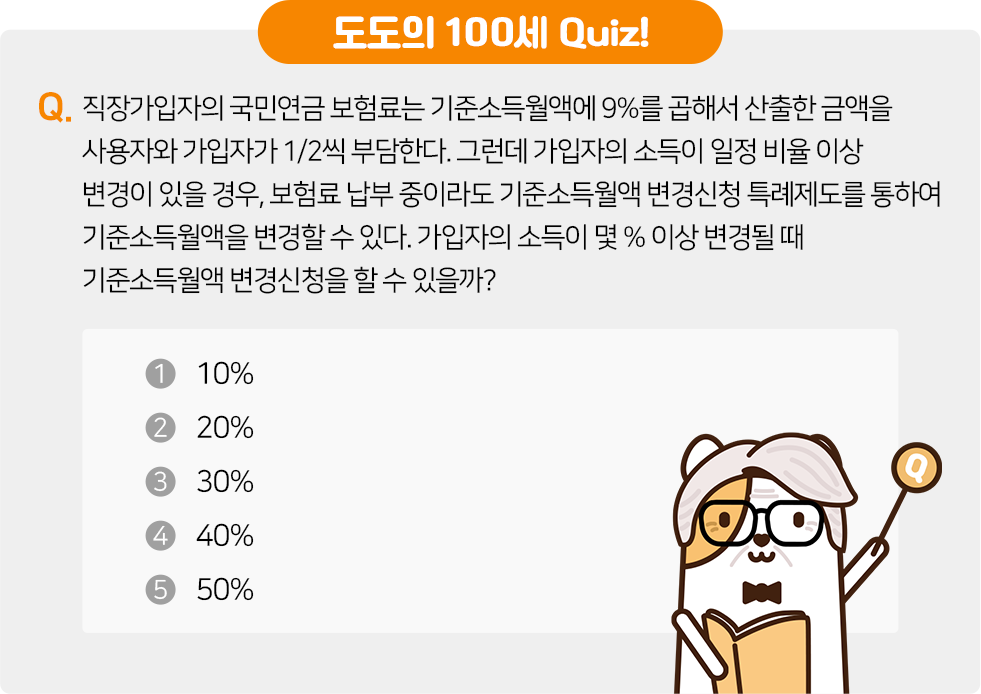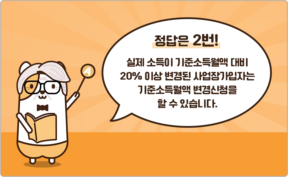 그렇다면 오늘의 정답은? 정답은 2번, ‘20%’입니다! 실제 소득이 기준소득월액 대비 복지부 장관이 고시하는 소득변동률(20%) 이상 변경된 사업장가입자는 신청일의 다음 달부터 다음 연도 정기 결정 전월까지의 기간까지 변경된 기준소득월액을 적용합니다.