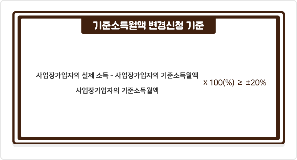 증가했는지 감소했는지와 무관하게, 실제 소득과 기준소득월액과의 차액이 기준소득월액의 20% 이상인 사업장가입자라면 기준소득월액 변경신청으로 보험료를 조정할 수 있습니다😎 |