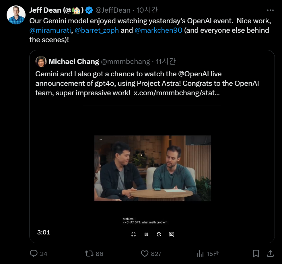 "우리 제미나이 모델이 어제 오픈AI 이벤트를 즐겁게 시청했어요. 무라티 CTO, 마크 첸, 바렛! 훌륭한 작업입니다! (그리고 뒤에서 일하셨던 분들도요).
