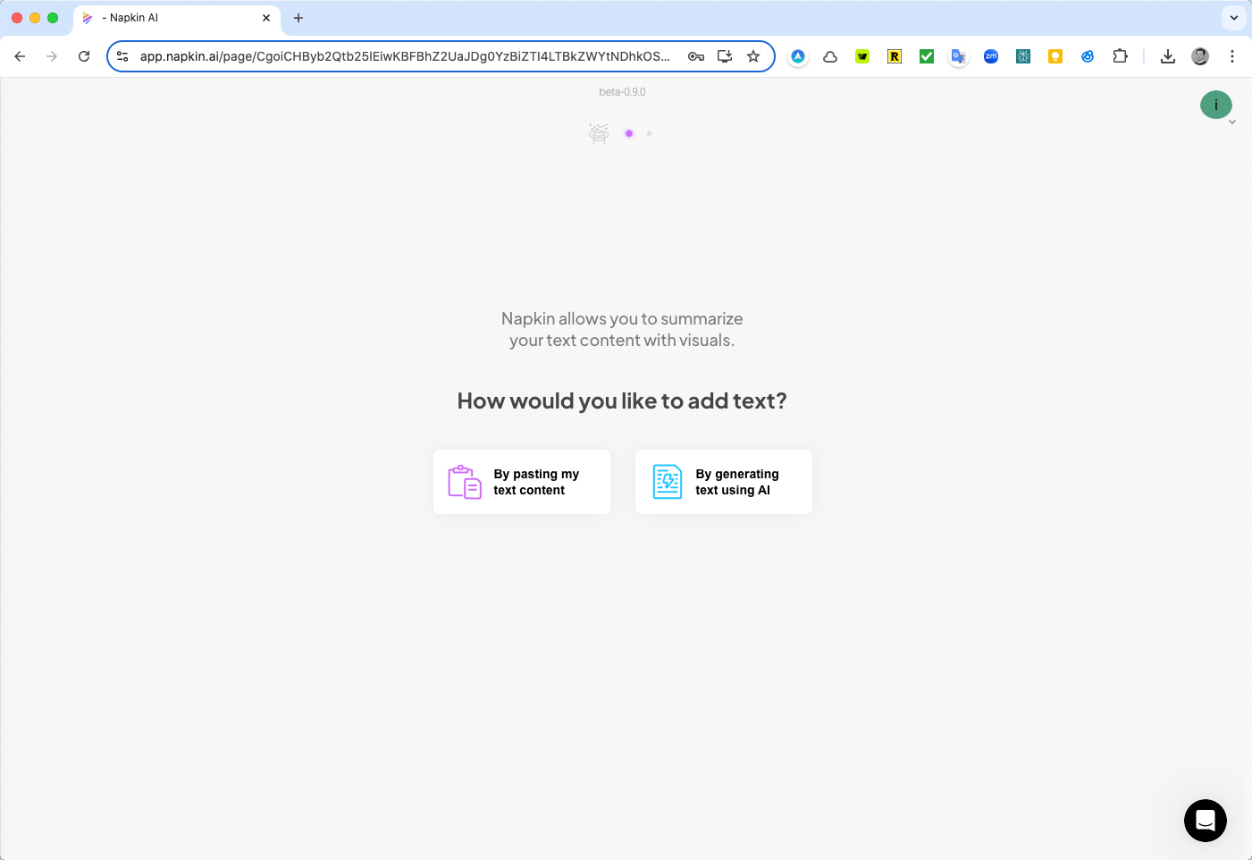 Napkin.ai를 사용하는 방법은 매우 간단합니다. 계정을 생성한 후, 로그인하고 접속하면 ChatGPT와 같이 프롬프트를 입력하는 방식과 텍스트를 붙여넣기하는 2가지 방식의 입력이 가능합니다.
