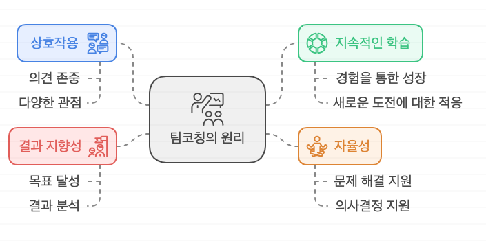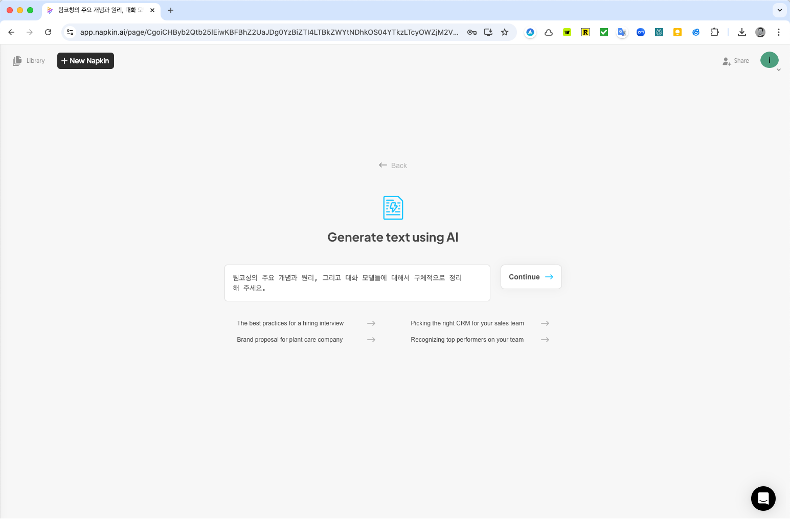 생성방식을 선택하고 “팀코칭의 주요 개념과 원리, 그리고 대화 모델들에 대해서 구체적으로 정리해 주세요”라는 프롬프트를 입력 후, “Continue” 버튼을 클릭하면 텍스트 기반의 내용이 먼저 생성됩니다.