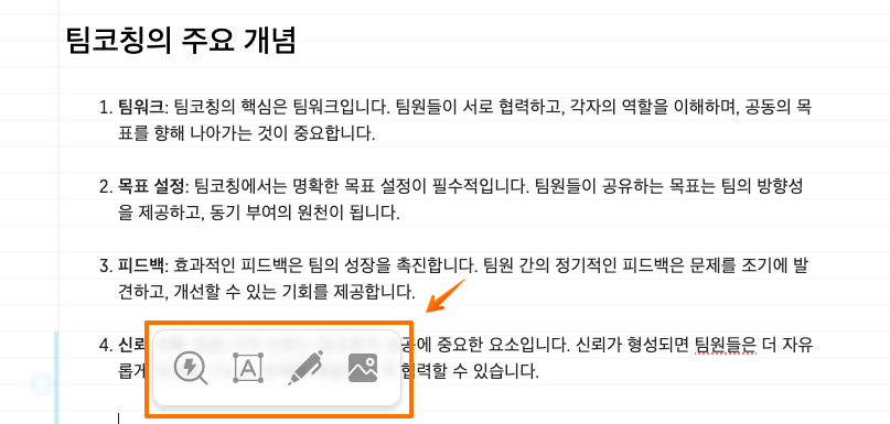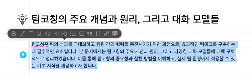 Napkin.ai에서는 “노트(Note)”를 기반으로 문서를 작성할 수 있습니다. 노트에 입력한 프롬프트의 내용이 먼저 텍스트로 생성됩니다. 생성된 텍스트에서 그림이나 도식, 도해등으로 표시하고 싶은 글의 영역들을 선택하면, 아래와 같이 파란색의 번개모양의 아이콘이 표시됩니다. 이 아이콘을 누르는 것만으로 Napkin.ai가 해당 내용의 도표나 도해를 그려줍니다.