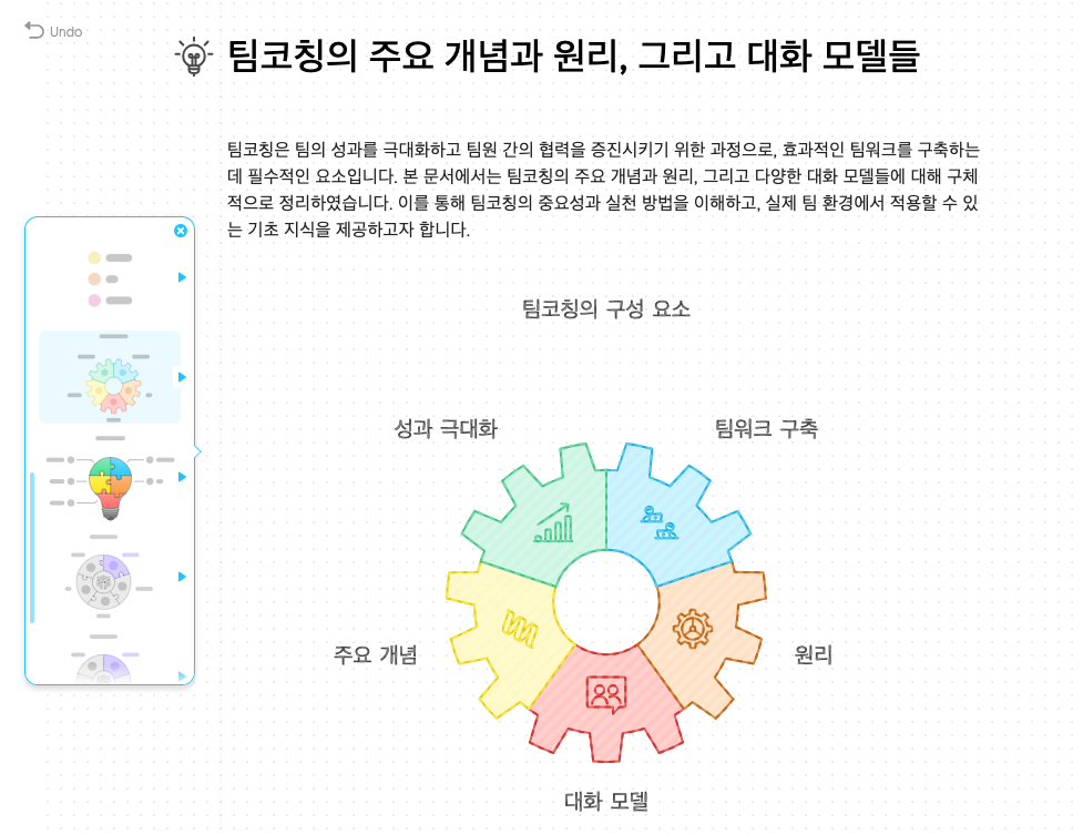 아래와 같이 다양한 스타일의 도해등의 선택이 가능하며, 글의 내용을 보다 더 잘 설명할 수 있는 도해와 내용을 여러가지 선택지에서 선택할 수 있으며, styles를 선택하여 다양한 색상으로 그려진 도해를 적용해 볼 수 있습니다(아래의 3가지 생성된 도해 - 기어(gear) 다이어그램, 마인드맵, 플로우(flow) 다이어그램) . 사용 상의 제약사항으로 일단 생성된 도해에 대해서는 텍스트나 시각요소들의 배치등은 자유롭게 수정이 가능하지만, 다른 도해로 일괄 변환은 지원되지 않습니다(많이 아쉽네요). 다른 형태의 도해로 변경하려면, 텍스트를 다시 선택하고 파란색의 번개 아이콘을 다시 눌러 그려야하는 번거로움은 있네요.