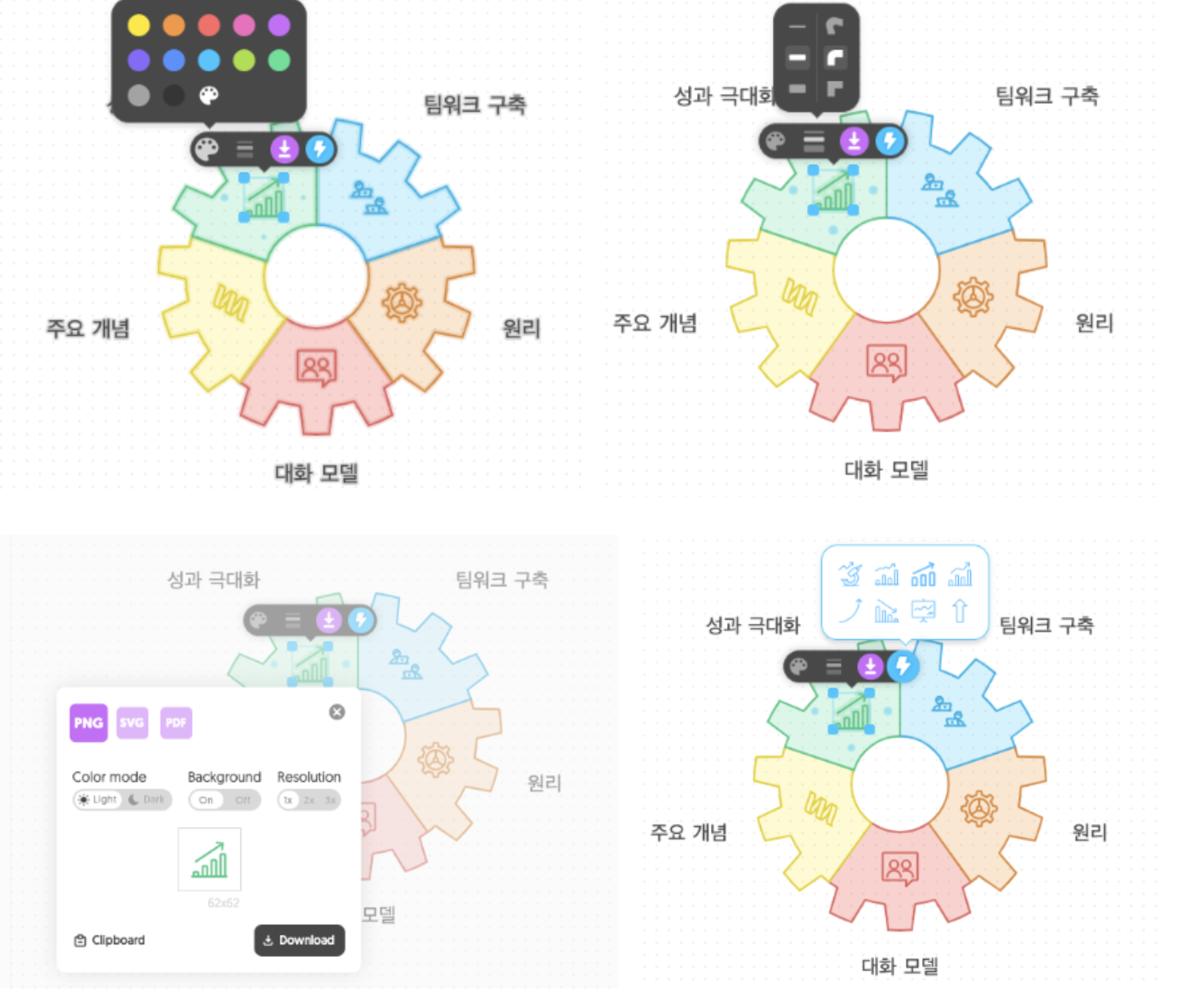 생성된 도해에서 아이콘 등의 변경이 필요하면, 수정이 필요한 아이콘을 선택하여 색상, 선의 굵기, 다운로드(분홍색), 제안(파란색) 메뉴가 표시됩니다. 다운로드 아이콘을 선택하면, 선택한 아이콘을 PNG, SVG, PDF 형식으로 다운로드 받을 수 있으며, 제안 아이콘을 선택하면 선택한 아이콘과 다른 모양의 아이콘들이 표시되어 선택할 수 있습니다.