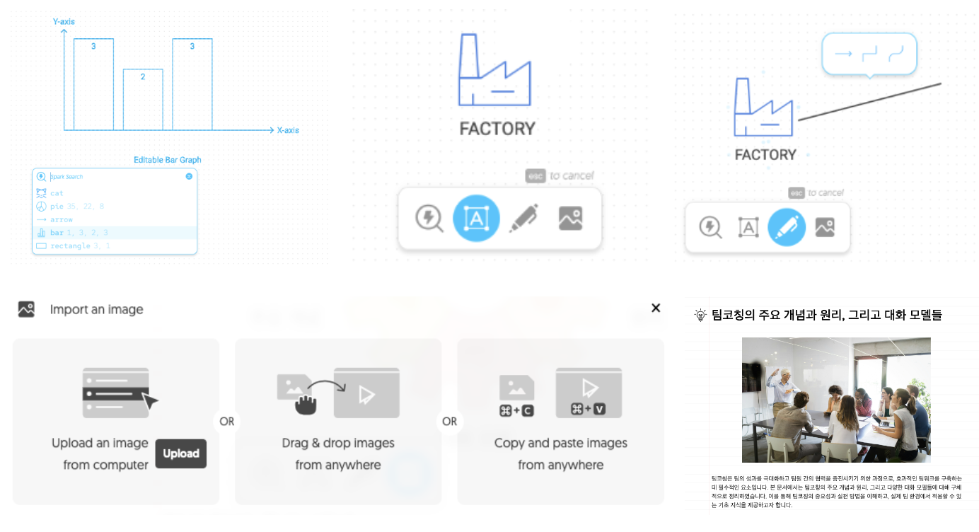 Spark Sketch는 노트 내에 아이콘이나 픽토그램을 손쉽게 추가하도록 지원하며, 검색을 통해 필요한 항목들을 찾고 바로 추가할 수 있도록 도와줍니다. Label은 노트 내에서 아이콘이나 제목, 내용 등을 작성할 때 사용합니다. Sketch는 시각적 요소들 간의 연결선을 그리기 위해 사용됩니다. 라인이나 화살표 등으로 선의 속성을 손쉽게 변경할 수 있습니다. Image의 경우, 컴퓨터나 인터넷에서 다운로드 받은 이미지를 노트에 추가하는 기능을 제공합니다.