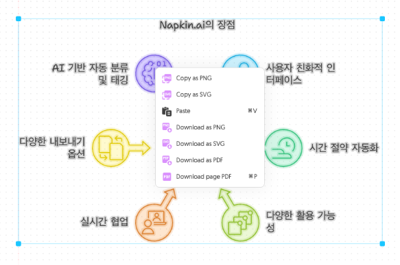 Microsoft Office, Google Workspace 등 널리 사용되는 소프트웨어와의 통합이 가능해, 기존의 업무 환경을 크게 바꾸지 않고도 쉽게 업무나 일에 도입할 수 있습니다. Napkin.ai의 노트에서 생성한 도식화 이미지나 차트등을 다운로드 받아서 바로 사용이 가능합니다. Office나 Google Presentation에서도 차트나 도표등을 직접 만들기보다 Napkin.ai에서 생성하고 이를 편리하게 활용하는 방안도 유효합니다. 이는 새로운 도구 도입에 따른 학습 비용과 시간을 최소화하고, 빠르게 생산성 향상 효과를 볼 수 있게 해줍니다.