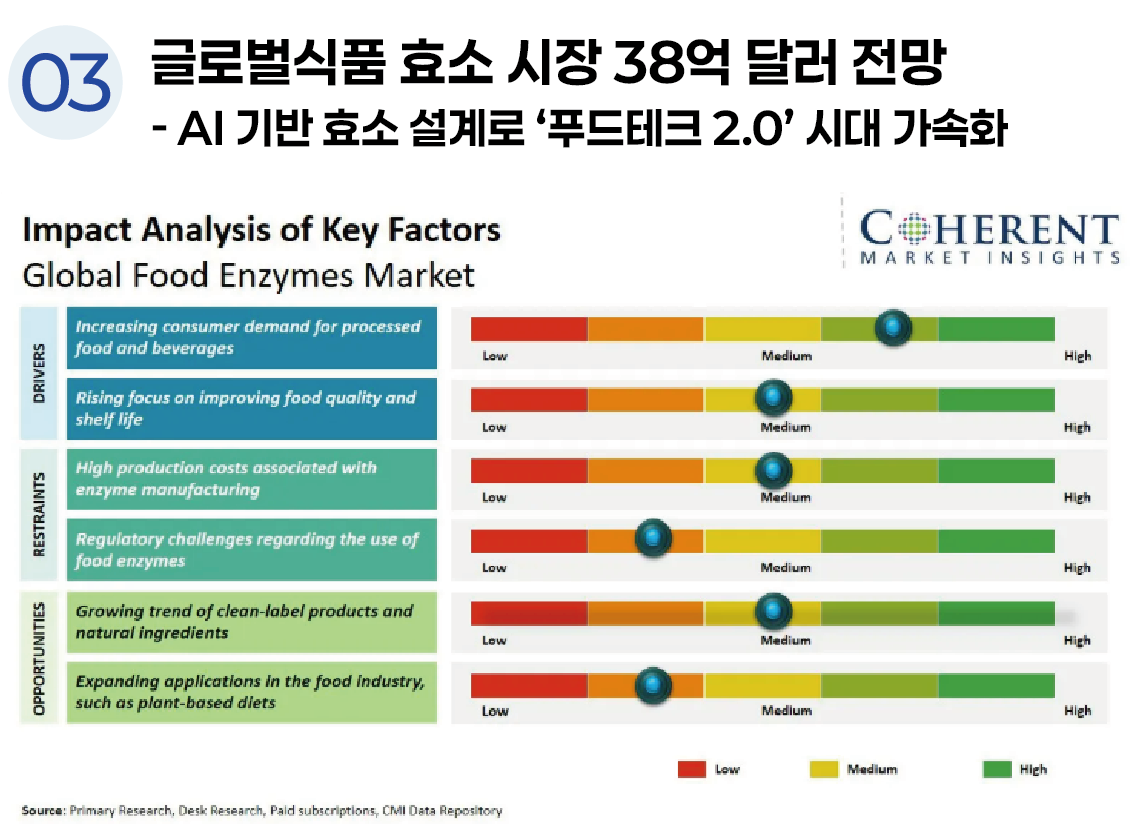 - 인사이트: 이제 효소는 단순한 소모품이 아닙니다. 우리 제품만의 독보적인 풍미나 제형 안정성을 완성하는 '전략적 IP(지식재산권)'이자 핵심 가치 동력(Value Driver)입니다.