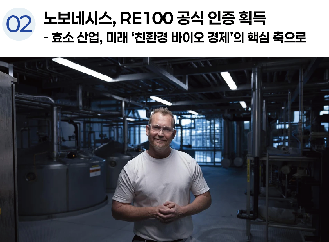 (주)노보네시스가 최근 기업 운영에 필요한 모든 전력을 100% 재생에너지로 전환하며 RE100 공식 인증을 획득했습니다. 이는 단순한 에너지 교체를 넘어, 효소 산업이 기후 위기라는 인류 공통의 과제에 어떻게 실질적으로 기여할 수 있는지를 보여주는 강력한 사회적 가치 실현의 이정표입니다.