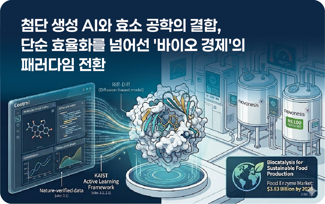 특히 최근 Nature지에 게재된 오스트리아 그라츠 공대의 Riff-Diff(Diffusion-based model) 기술과 KAIST 이상엽 특훈교수 연구팀의 능동 학습(Active Learning) 프레임워크는 이러한 변화가 연구실을 넘어 산업 현장의 표준이 되었음을 입증합니다. 이러한 기술적 도약 앞에서 식품 및 제조 산업의 리더들은 다음의 세 가지 질문을 통해 자사의 제품 전략을 점검해야 합니다.