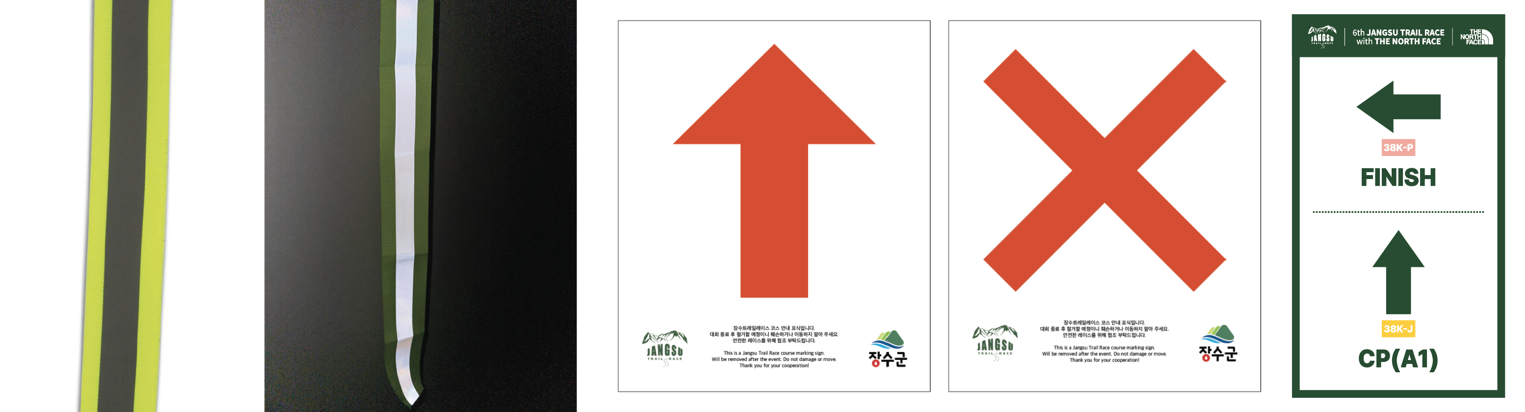 장수트레일레이스는 다음과 같은 마킹 시스템을 사용하여 코스를 안내합니다. 다른 종목과 겹치는 구간은 에이보드 및 표지판에 별도 안내할 예정이니, 레이스 중 마킹을 주의 깊게 확인하세요!