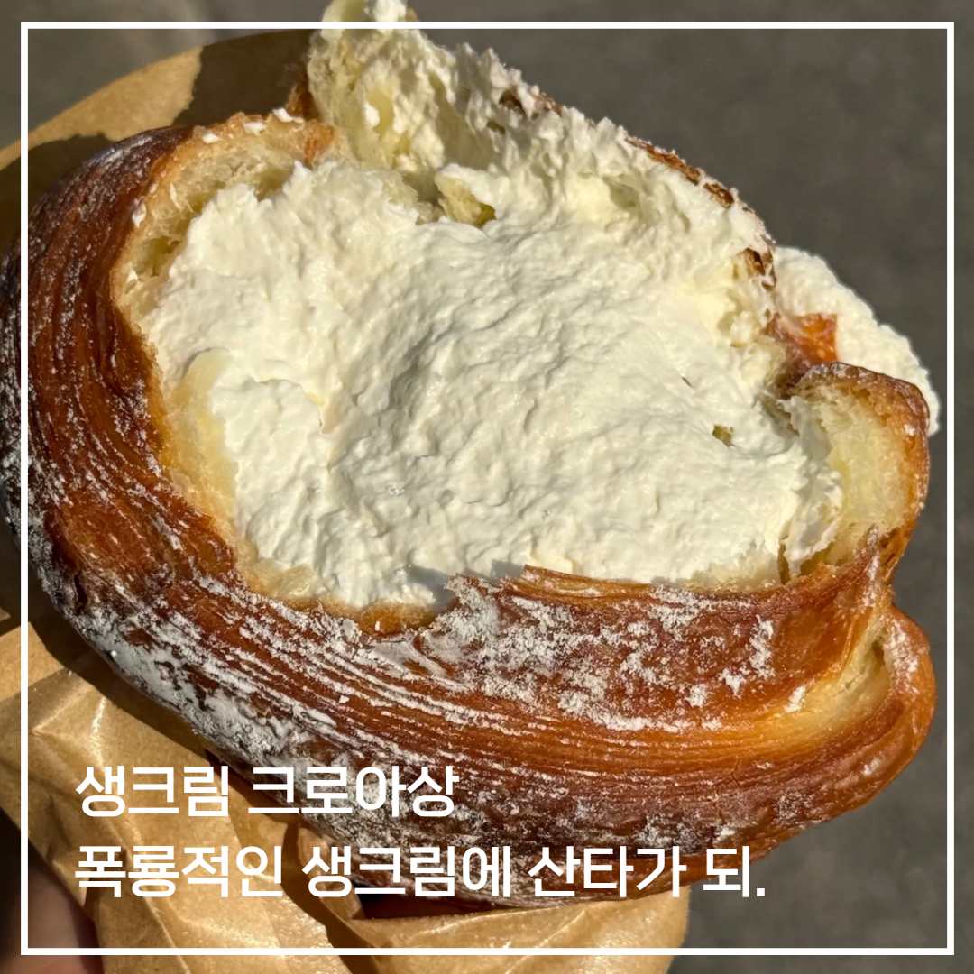 어떤 곳에서도 이런 비주얼의 생크림 크로아상은 보지 못했어요. 크로아상을 반으로 갈라보는 순간, 생크림이 순두부 봉지를 가위로 자른 것처럼 폭발적으로 흘러나와요. 크림은 의외로 달지 않아서 우유의 몽글몽글함이 잘 느껴져요. 아주 조금만 더 가벼운 느낌이었으면 좋았을 텐데, 조금 입에 남는 느낌이라 아쉬웠지만 이 크기와 이 크림 양이라면 모든 게 용서가 돼요.