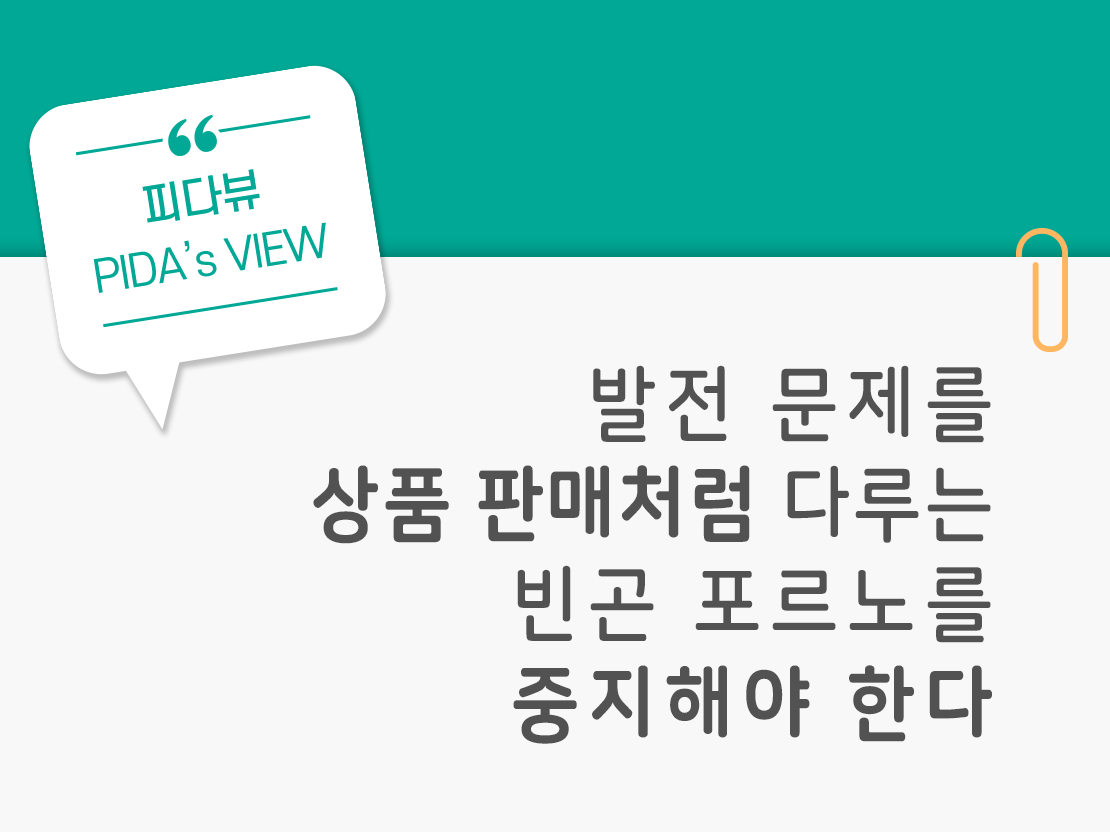 에디터의 지난 잘못에 대해 변명을 할 생각은 없어요. 하지만 소위 '먹히는' 홍보를 위해서는 '좋은 마음'으로 '돕고자' 하는 상대의 존엄을 착취해야만 하는 것이 공식처럼 여겨지는 현재의 모금 생태계는 분명 크게 잘못되어 있습니다. 그리고 그런 생태계가 지속되고 있는 데에는 끊임없이 개발도상국과 빈곤층에 대한 착취적인 이미지와 서사를 공급하고 있는 단체들, 그리고 이를 비판 없이 수용하고 소비하는 기부자들이 모두 책임이 있을 거예요. 어쩌면, 대통령 부인을 둘러싼 이번 빈곤 포르노 논란은 '비참함의 매매'가 일상화되어 있는 우리 사회에서 필연적으로 발생할 수밖에 없던 징후적인 사건인지도 모르겠습니다.