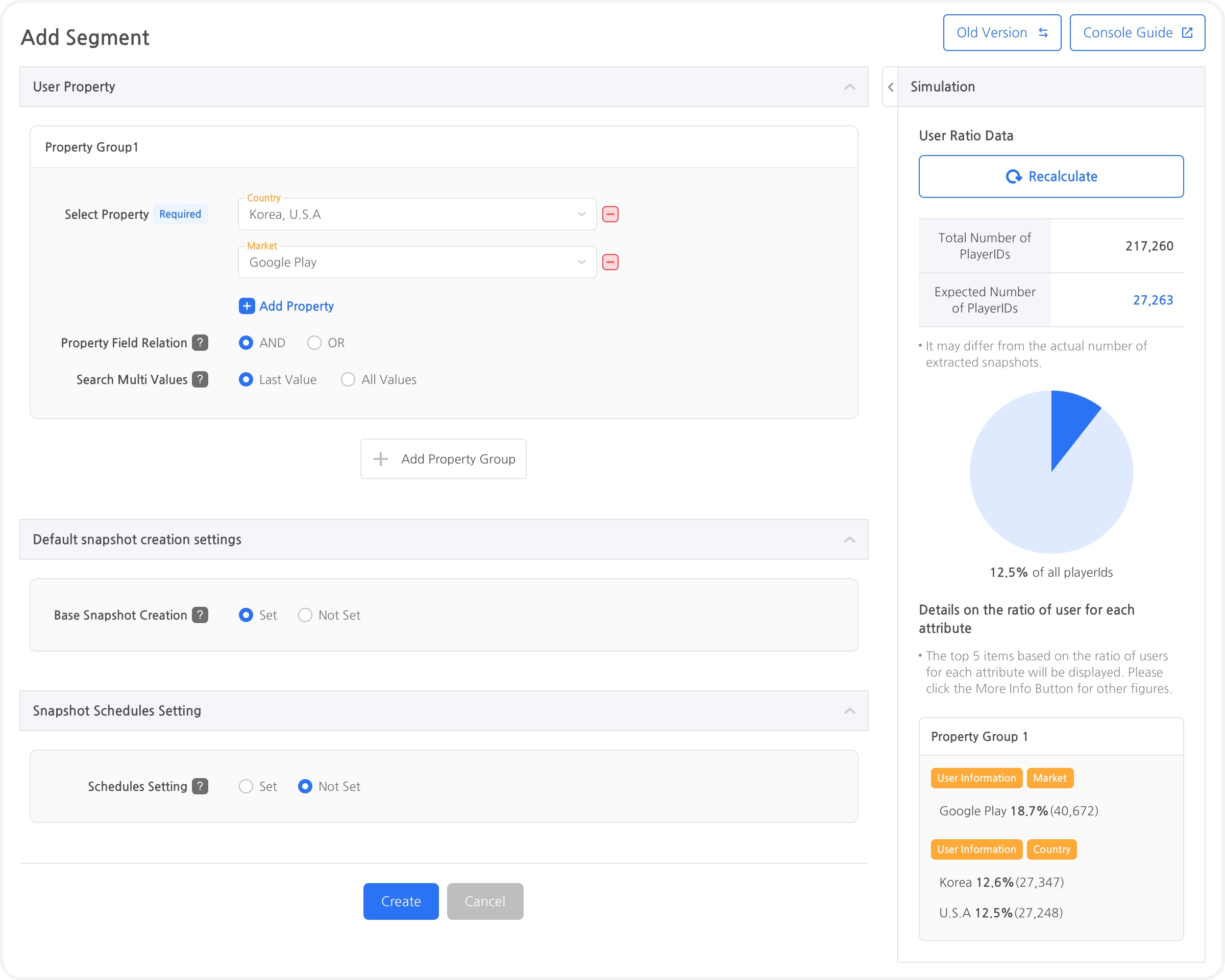 The Segment - Simulation tool allows you to pick the desired attribute conditions on the segment creation page and quickly verify the predicted number of users and their ratio to the overall number of users before creating snapshot data. This method allows you to determine whether the expected number of playerIds fits your expectations, and if doesn't, you can determine what conditions cause playerIds to be lost, among other things. |