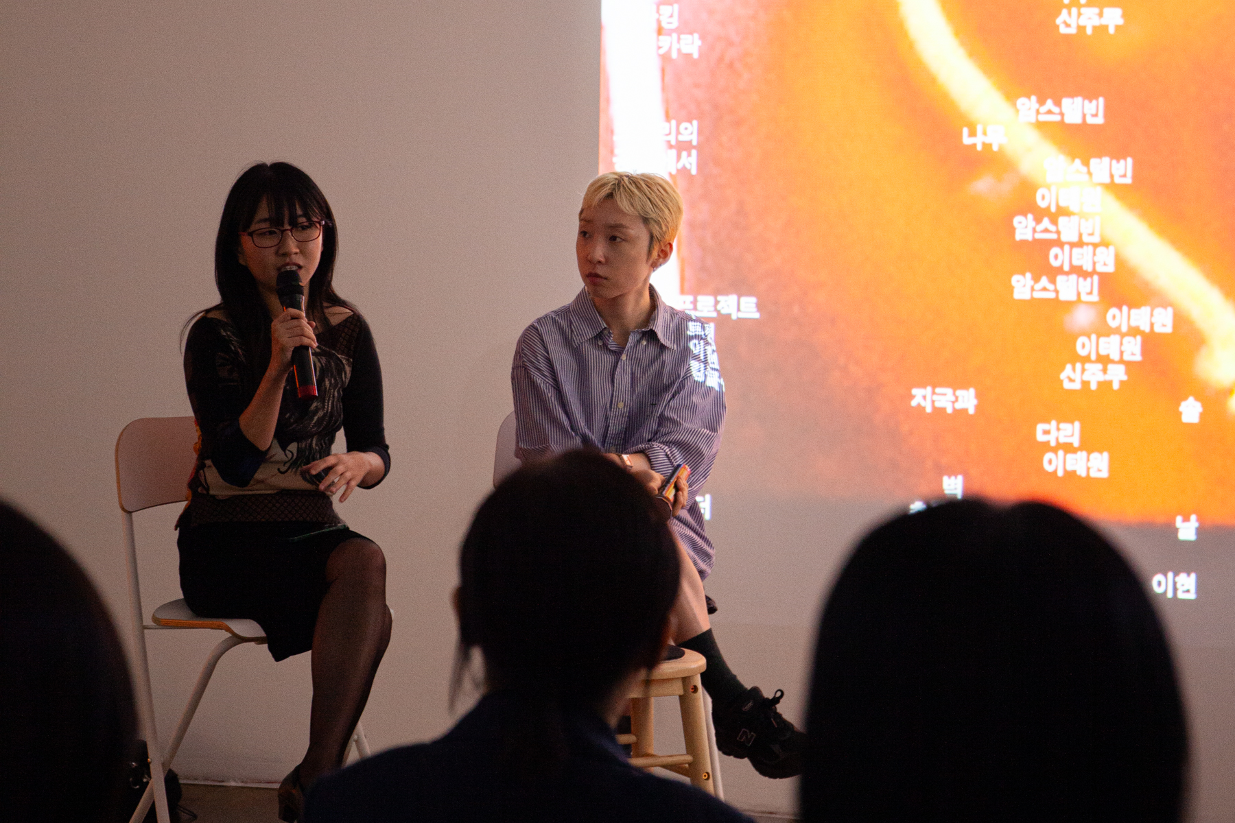 In conjunction with 𝘰𝘧𝘧-𝘴𝘪𝘵𝘦 2: 𝘌𝘭𝘦𝘷𝘦𝘯 𝘌𝘱𝘪𝘴𝘰𝘥𝘦𝘴, a series of artist talks is being held to offer deeper insights into the practices of the participating artists. The third session featured a conversation with artists Jaeyun Sung and Hong Jiyoung, who explore queer and gender identity through photography. The discussion ranged from introductions to their new works presented in the exhibition, to their collaborative activities with W/O F., and reflections on the meaning of working together while sharing friendship. Please also look forward to the final event of this exhibition, an artist talk with Jo Hyunjin!