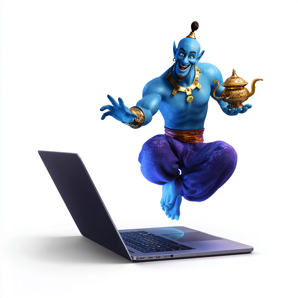 노트북 화면에서 파란색 지니가 황금 주전자를 들고 튀어나오는 모습을 담은 이미지입니다. 현실과 판타지가 결합된 장면으로 디지털 세계에서 마법이 펼쳐지는 듯한 인상을 줍니다. 마치 램프 속 지니가 즉시 소원을 이루듯 사용자의 상상을 실시간으로 구현하는 새로운 AI 시대가 열리고 있습니다. <사진=미드저니>