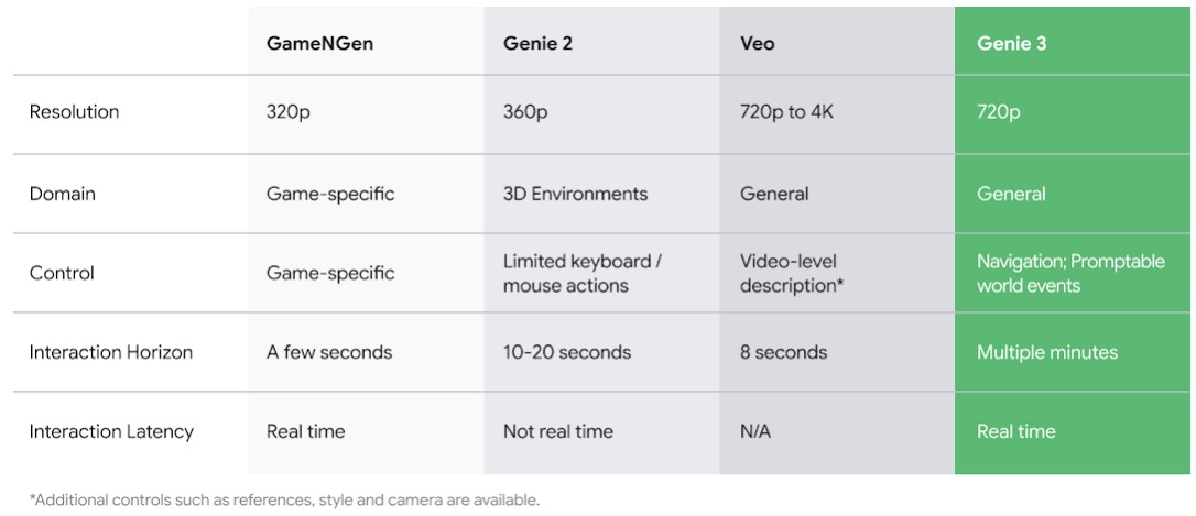 지니3와 이전 모델인 지니2 및 동영상 생성 AI 모델 비오를 비교한 표입니다. 지니2는 상호작용 가능한 시간이 10~20초에 불과했지만 지니3는 수분으로 향상됐습니다. 또 기존 모델은 키보드와 마우스 조작만 가능했지만, 이제는 프롬프트를 통해 움직임에 추가 변화를 줄 수 있습니다. <캡처=구글 딥마인드 공식 홈페이지>