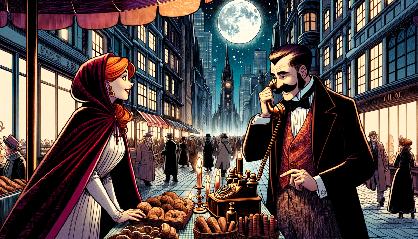 Under the full moon, the bustling city streets are filled with pedestrians enjoying the culture. DALLE 3. OpenAI.