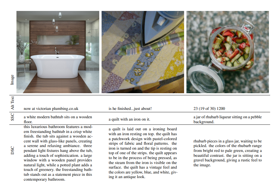 Examples of images scraped from the internet and short synthetic captions (SSC), descriptive synthetic captions (DSC).