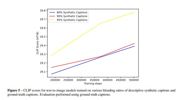 Comparison of model performance based on different caption types(CLIP Score). as the ratio of synthetic captions increased, the performance improved.